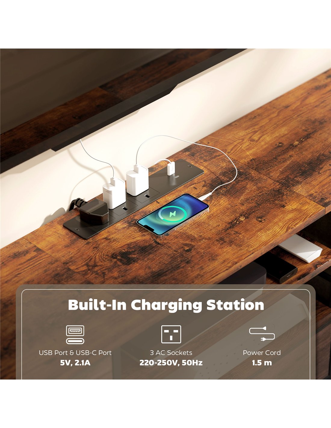 - A: Yes, the stand features three built-in AC sockets and two USB ports to keep your devices powered and organised.