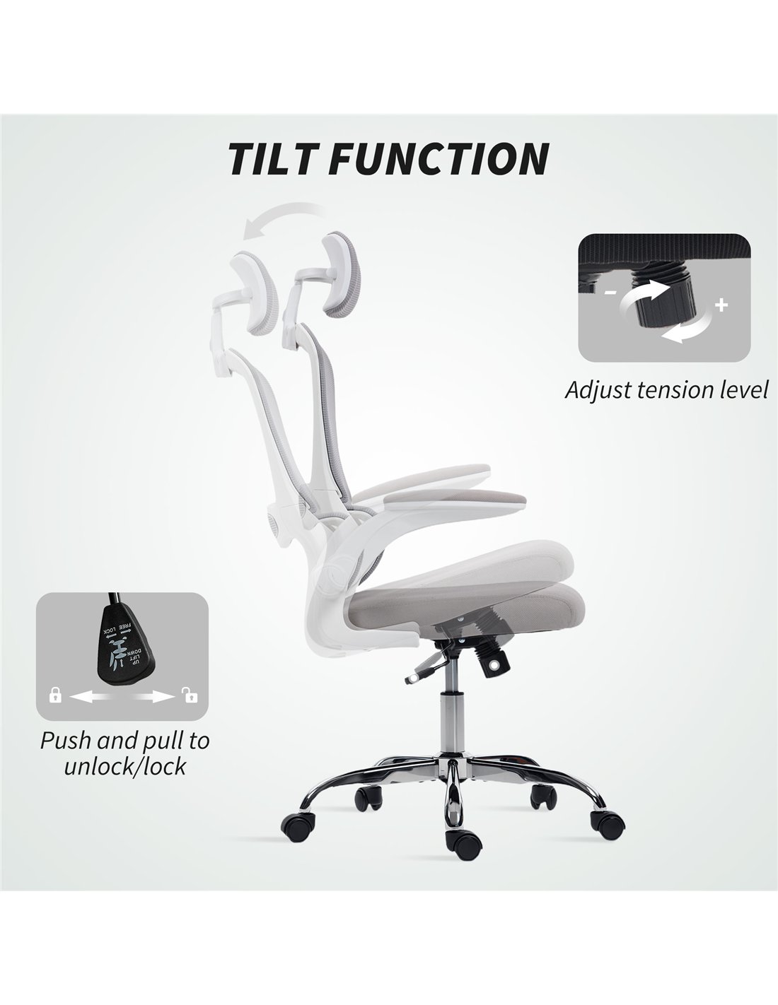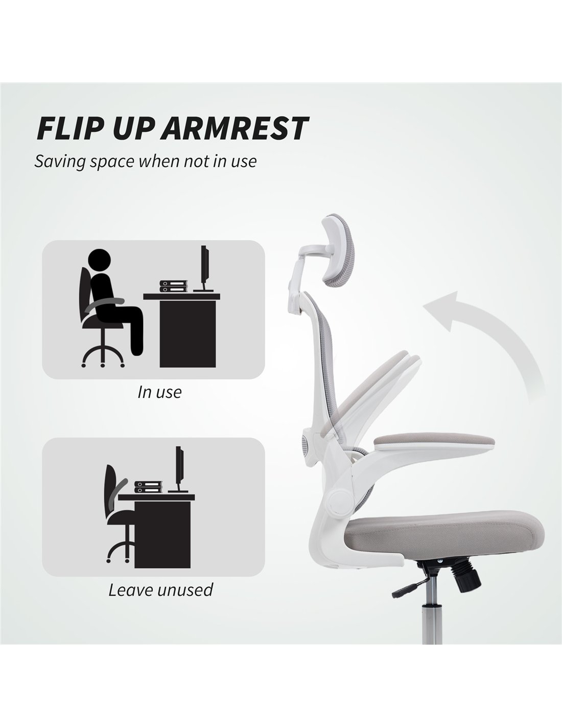 The HOMCOM Mesh Back Office Chair in Grey provides ergonomic support for your daily workday. This office chair features lumbar support, promoting posture and lower back comfort during work. A padded seat offers comfort, while the breathable mesh fabric maintains airflow, keeping you cool. Adjust your seating position with a 43-51 cm seat height. An adjustable headrest offers support for your head and neck. Save space; flip the armrests up to fit the chair under your desk. Enjoy mobility around your workspace through a 360° swivel seat and five wheels. Built for durability, this chair supports users up to 120 kg. It presents a functional, comfortable seating for your UK home or office, supporting extended periods of use.