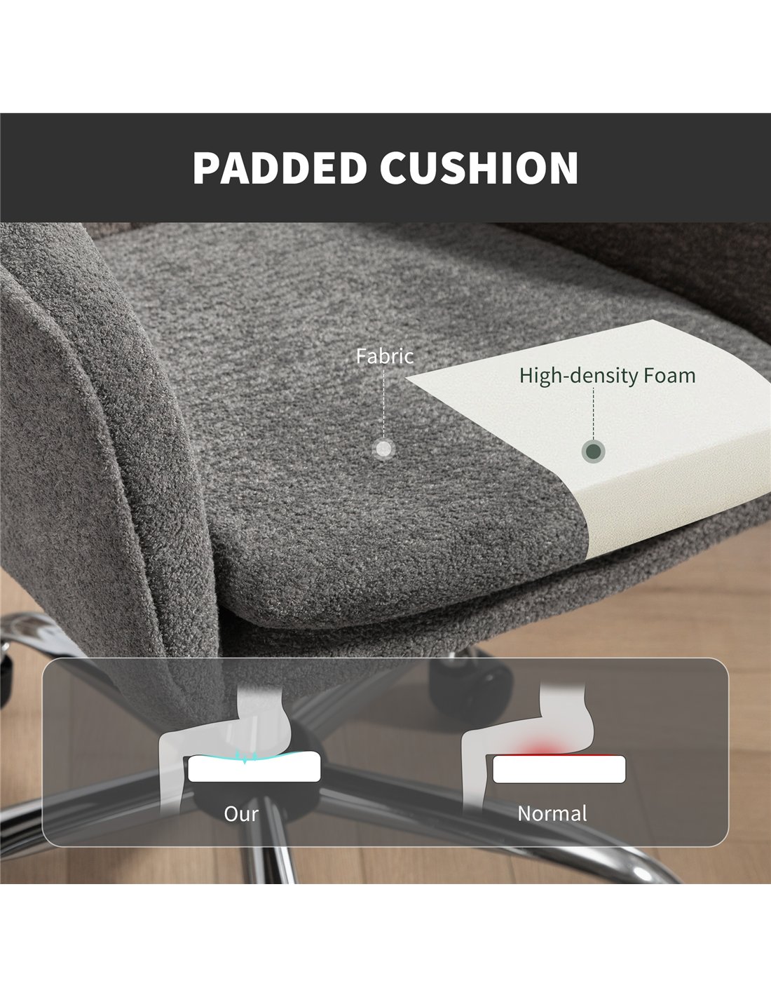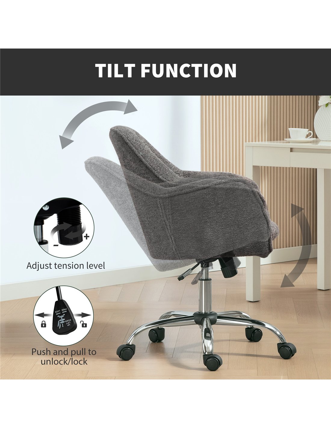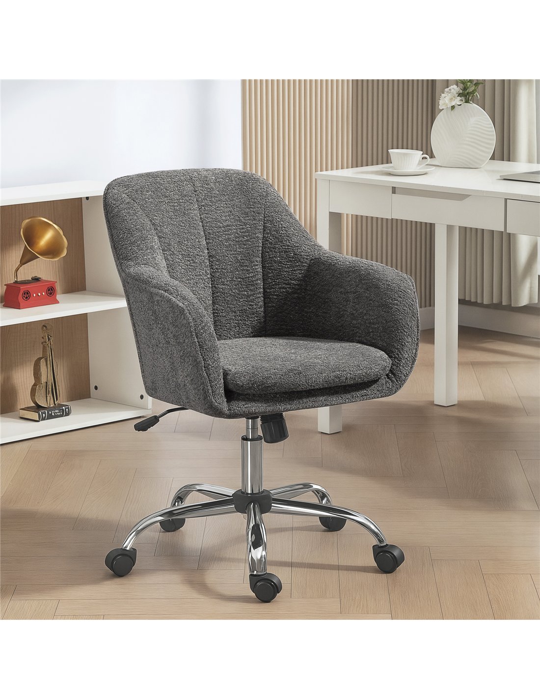 The HOMCOM Snow Flannel Office Chair in Grey delivers comfort and support for your workspace. This adjustable office chair features soft snow flannel fabric upholstery, enhancing your office environment. Adjust the seat height from 48 cm to 58 cm to find your optimal working level. A mid-rise backrest and integrated armrests provide essential lumbar and arm support, promoting better posture throughout your workday. The high-density foam filling ensures lasting comfort. Move freely with the 360° swivel seat and five smooth-rolling wheels. A robust steel frame supports users up to 120 kg, guaranteeing durability. This grey office chair combines practical adjustments with a comfortable design, ideal for daily office use in UK homes and businesses.