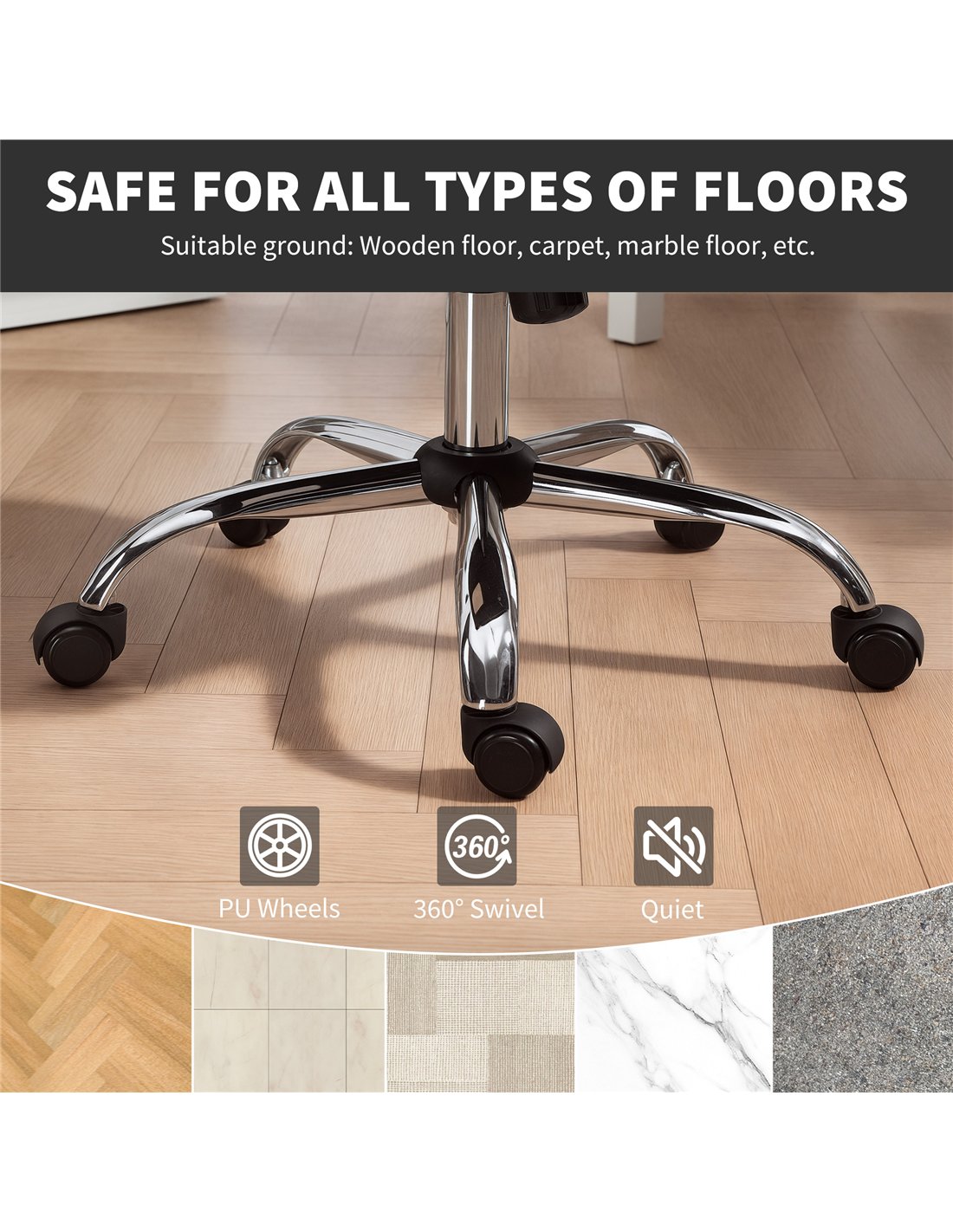 - 360° swivel seat moves with your body, with wheels for smooth movement on various floors