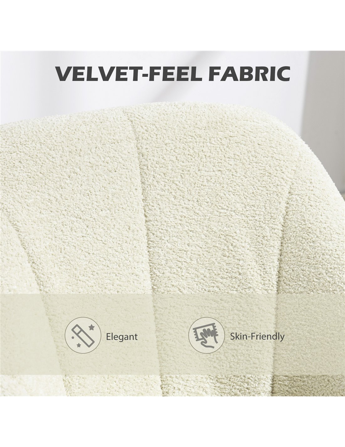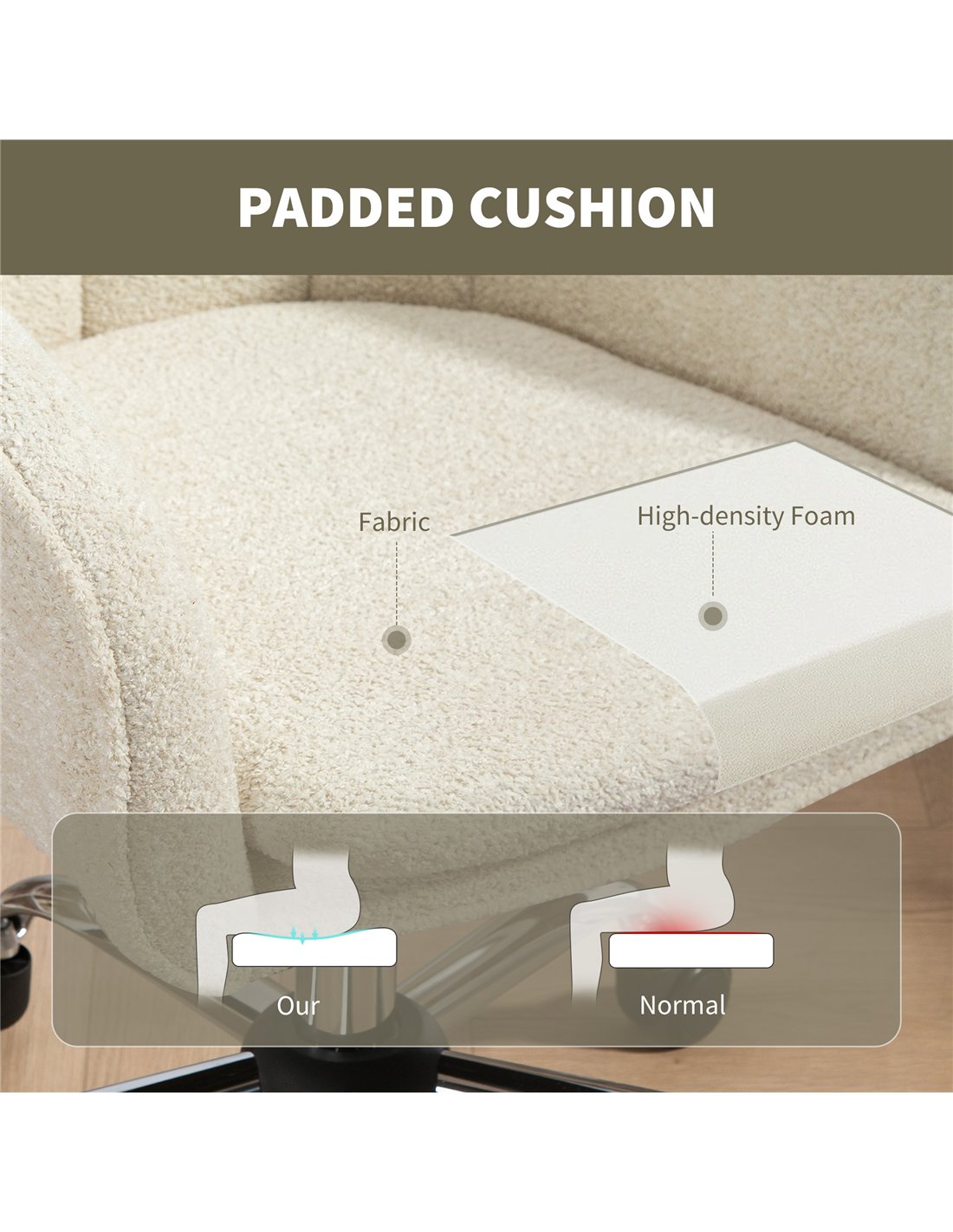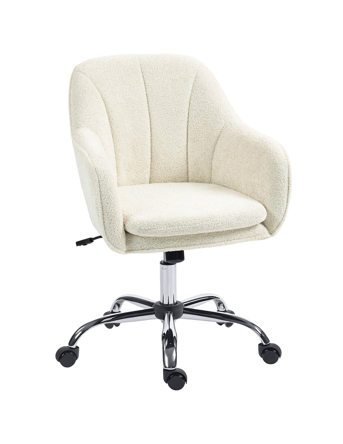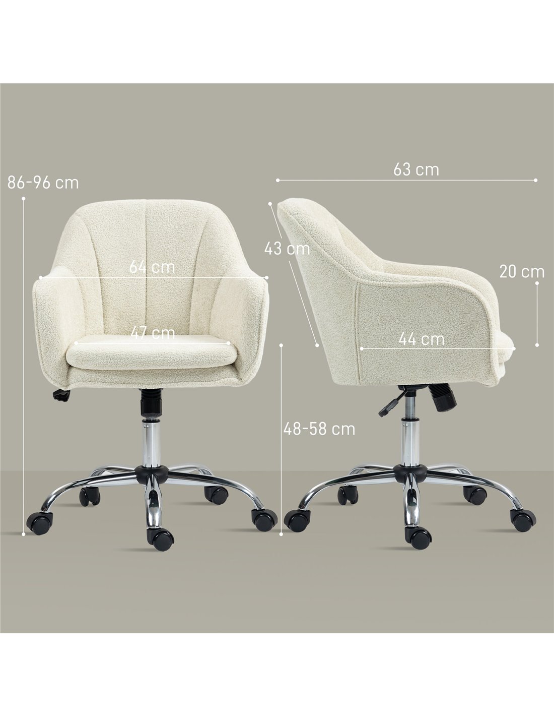 The HOMCOM Snow Flannel Office Chair in Beige delivers comfort and functionality for your UK workspace. It features soft snow flannel fabric upholstery. A tub-shaped design includes a mid-rise back and arms for posture support. Adjust the seat height from 48 cm to 58 cm for ideal positioning. High-density foam ensures lasting comfort. Enjoy full mobility with a 360° swivel seat and five smooth-rolling wheels. A built-in rocking motion provides relaxation. The chair features a strong steel frame, supporting up to 120 kg. Overall dimensions are 64W x 63D x 86-96H cm, suitable for various office environments. Assembly is required for this beige office chair.