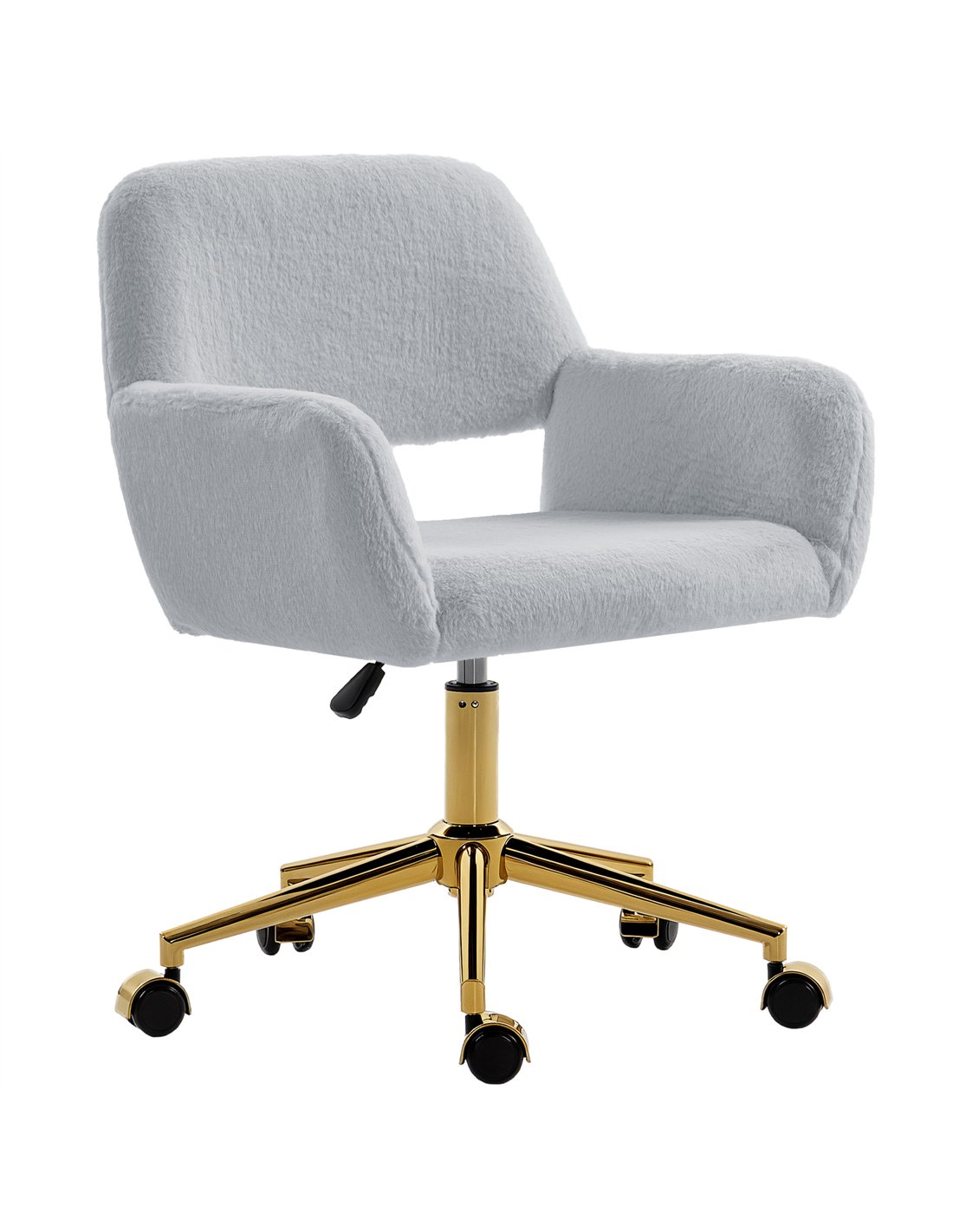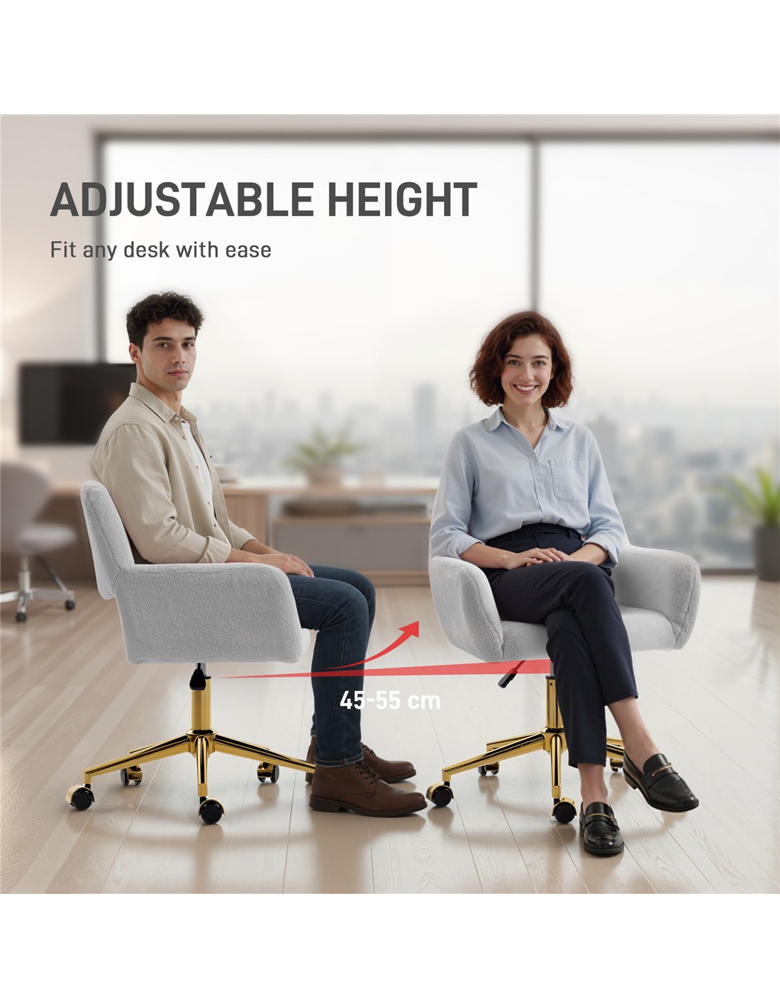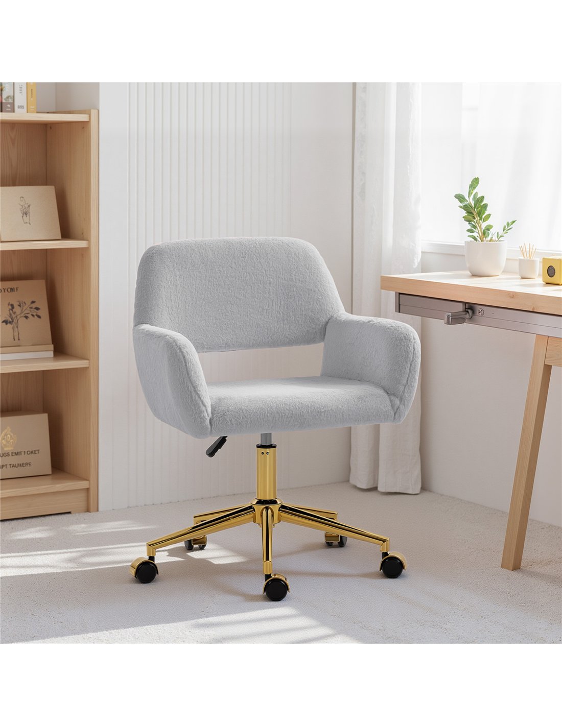 Elevate your workspace with the HOMCOM Faux Fur Rabbit Chair in Grey from FastDaddy. This desk chair combines plush comfort with practical design. It features soft faux fur upholstery and high-density foam padding for comfortable support throughout your day. The seat retains its shape for consistent use. Adjust the seat height from 45 to 55 cm to suit your desk. A 360° swivel function provides fluid movement, while five durable PU wheels ensure easy mobility across your floor. The sturdy steel base, finished in a gold tone, adds a touch of elegance, complementing the luxurious grey faux fur. This chair supports up to 120 kg, offering a stylish and ergonomic solution for any home office or study area.