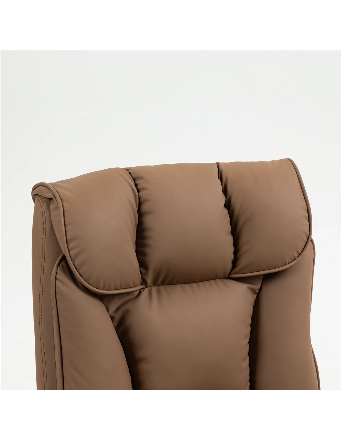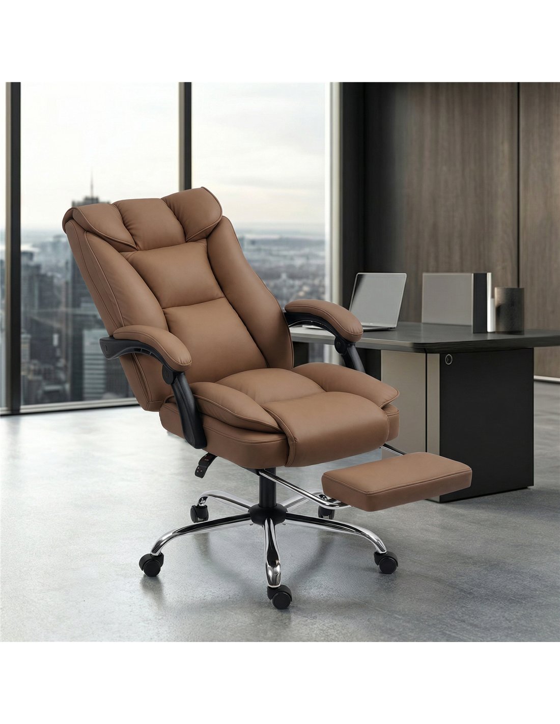 The HOMCOM 155° Reclining Faux Leather Swivel Office Chair in Brown provides comfort and support for your home or office. This ergonomically designed chair allows you to recline up to 155 degrees with an integrated manual footrest, promoting relaxation and lower body elevation throughout your workday. Enjoy superior comfort from the 13 cm double-layer foam padding. The durable, scratch-resistant faux leather upholstery, a pet-friendly material, offers a smooth, stylish appearance that is easy to wipe clean. Adjust your seating position with the 46-54 cm height adjustment. The 360° swivel seat and reinforced metal base with five smooth-rolling wheels ensure effortless movement around your workspace. This robust chair supports up to 120 kg. FastDaddy delivers quality office solutions across the UK.