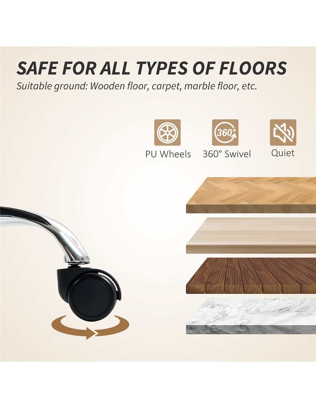 - A: The chair is upholstered in scratch-resistant, pet-friendly faux leather. This material is smooth, stylish, and easy to wipe clean.