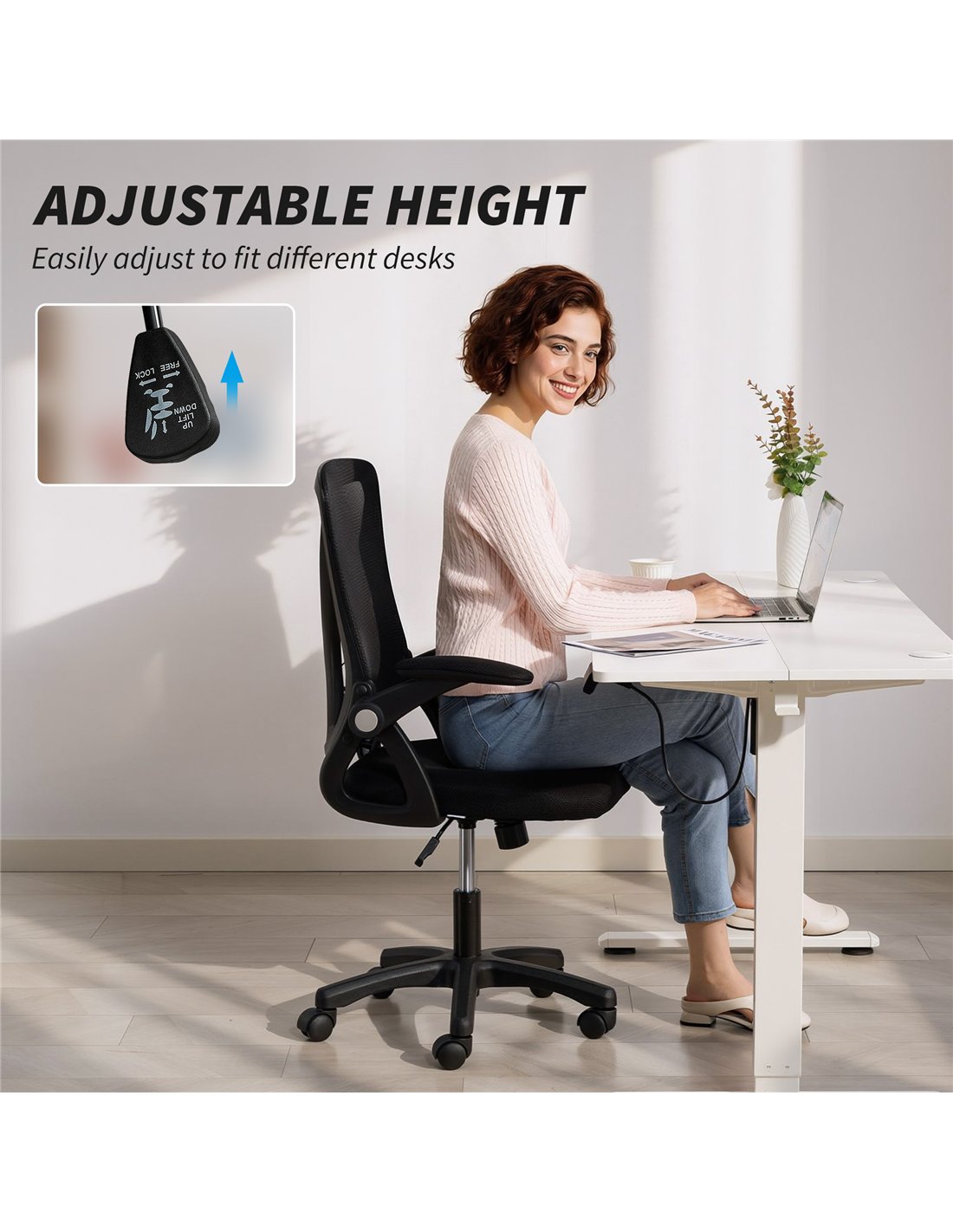 - A: Yes, the HOMCOM Office Chair offers an adjustable seat height from 42 cm to 52 cm. Its flip-up armrests also allow you to tuck the chair neatly under your desk, optimising space.