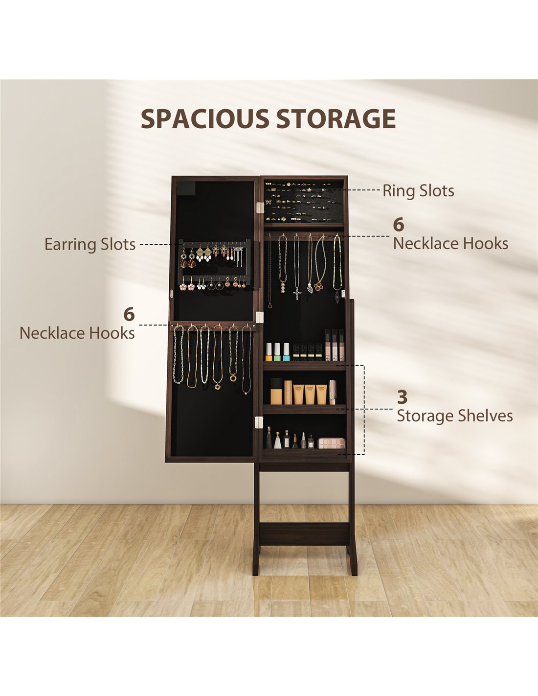 - A: This cabinet offers 70 ring slots, 32 earring pair slots, 12 necklace hooks, and three internal shelves for organised storage.