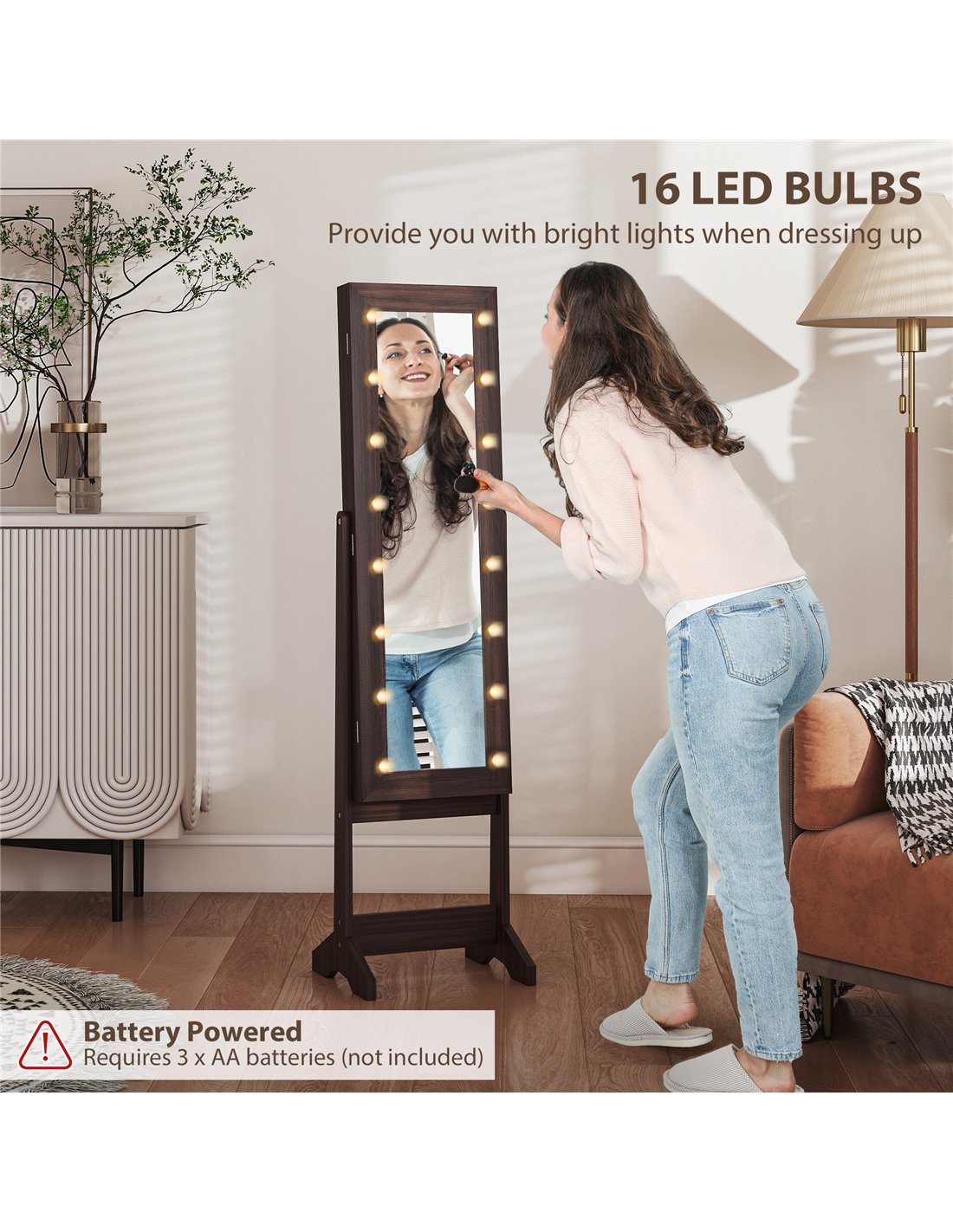 Organise your cherished items with the HOMCOM Freestanding Mirrored Jewellery Storage Cabinet in Dark Brown. This elegant cabinet provides comprehensive storage for your jewellery, makeup, and beauty essentials. A prominent full-length mirror features 16 warm white LED lights, illuminating your reflection for clear visibility, even in darker rooms. Please note, batteries are required for the lights and are not included. Open the cabinet door to reveal extensive internal storage. You will find 70 ring slots, 32 earring pair slots, 12 hooks for necklaces, and three practical shelves. A soft lining protects delicate items from damage. Adjust the mirror to one of three different angles to find your ideal position while preparing. Crafted from sturdy MDF and glass, this dark brown cabinet offers both style and functionality for your home. Assembly is required for this freestanding unit.