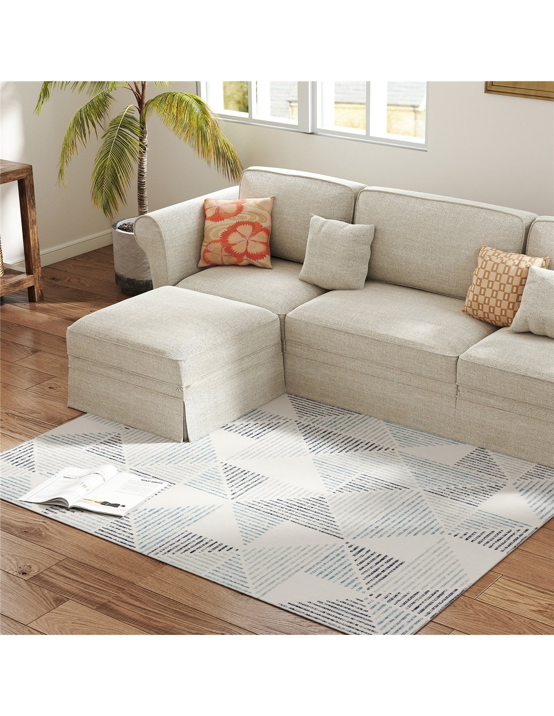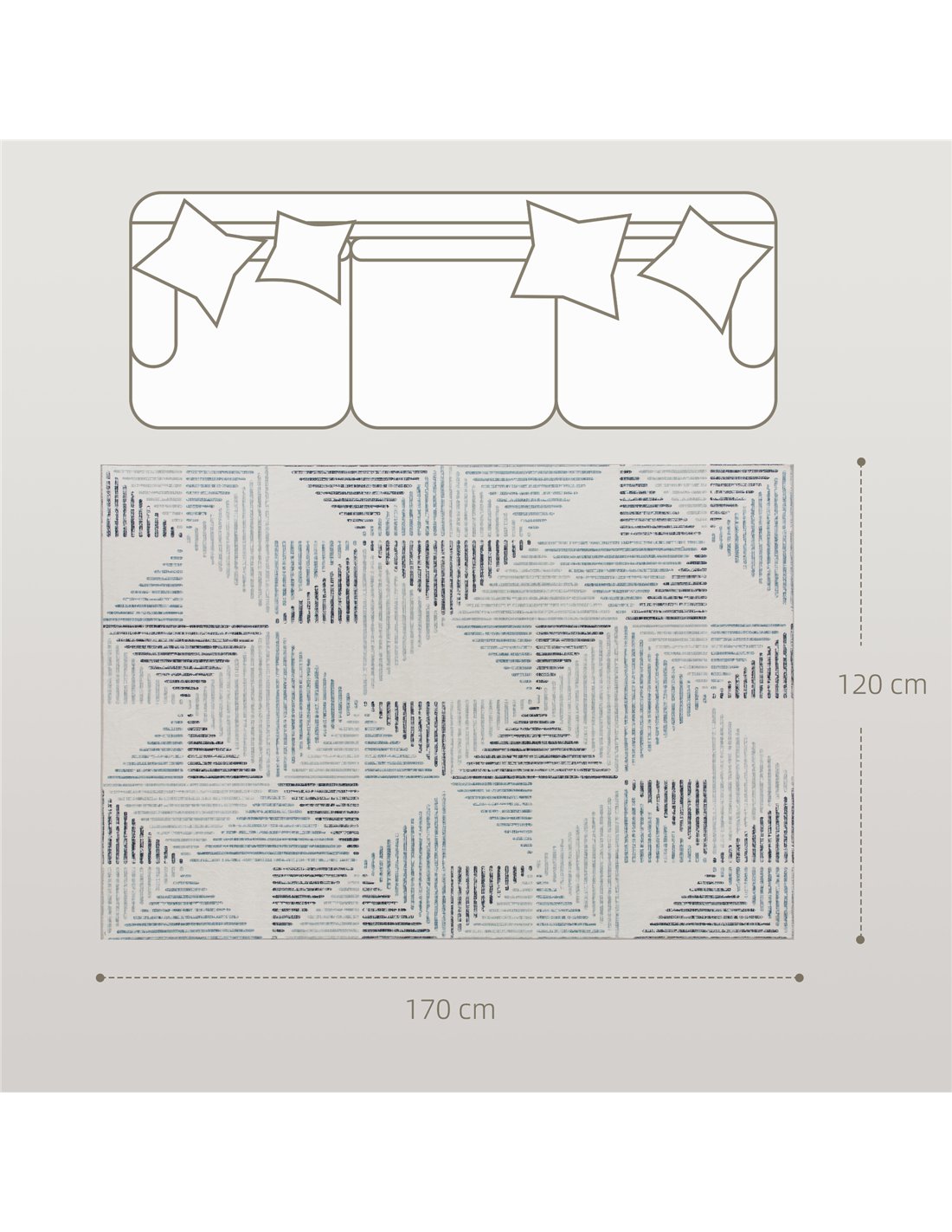 - A: This HOMCOM Modern Area Rug features a multi-coloured geometric pattern, measures 170 x 120 cm, and offers an ultra-soft 100% polyester surface. It includes a TPR non-slip backing and is fully machine washable.