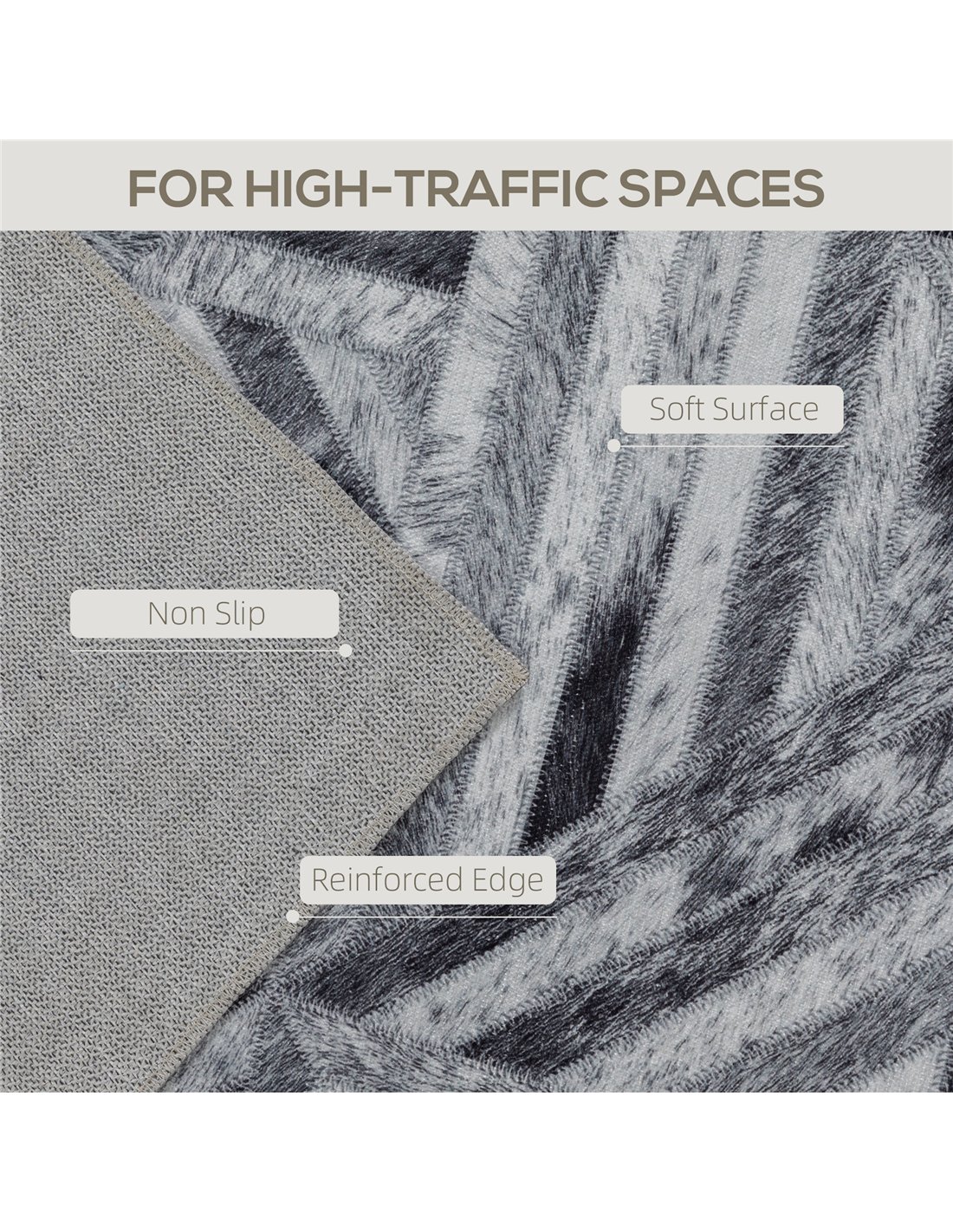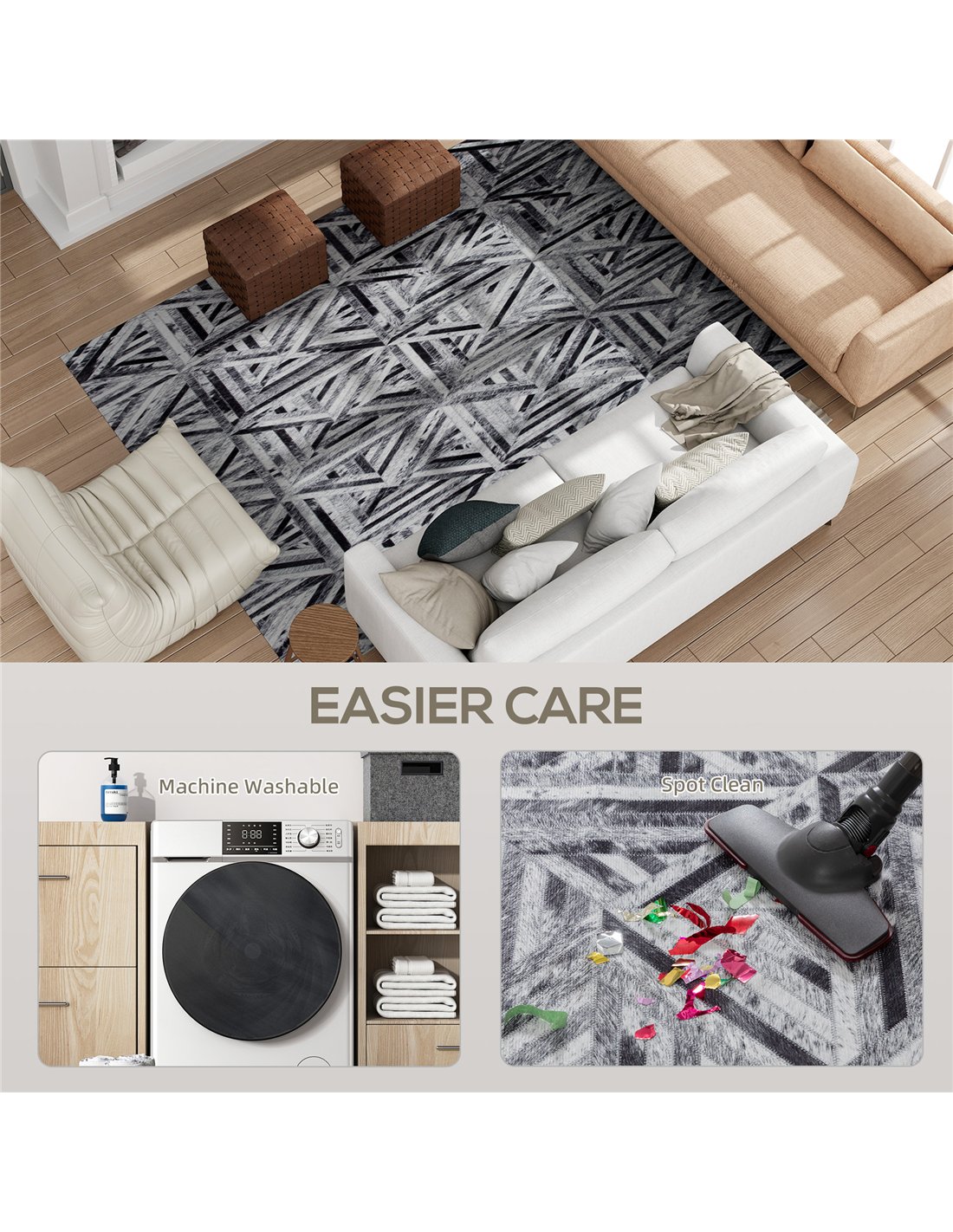 Elevate your interior design with the HOMCOM Modern Area Rug, an ideal choice for UK homes. This large black chenille floor carpet measures 290 x 200 cm, providing substantial coverage for living rooms, bedrooms, dining rooms, or home offices. Its distinctive triangle pattern, presented through a heat transfer printed faux leather patchwork design, introduces contemporary elegance to any space. Experience soft, plush comfort underfoot, while the non-slip backing ensures the rug stays securely in place on various floor types. Designed for practical living, this HOMCOM rug is completely machine washable. Alternatively, a quick wipe with a damp cloth maintains its fresh appearance. The foldable structure offers easy storage and portability, making this washable rug a versatile and stylish addition. Invest in lasting comfort and a refined aesthetic for your home.