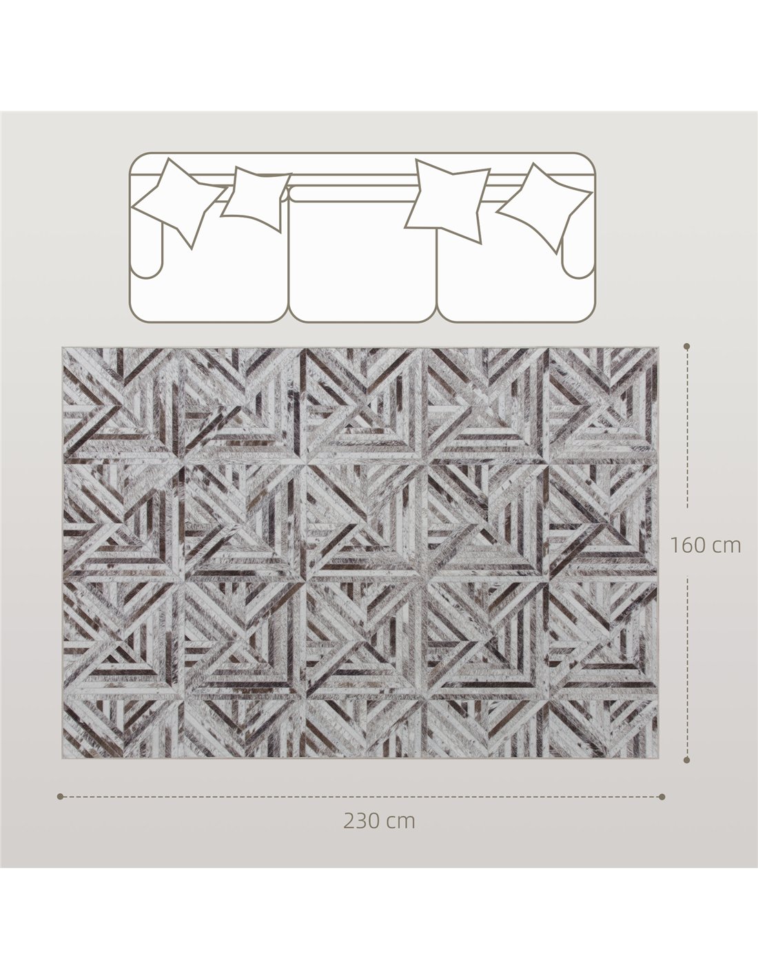 Elevate your home décor with the HOMCOM Modern Area Rug, a stylish and practical addition for any UK resident. This brown, 230 x 160 cm floor carpet introduces a distinct triangle pattern, providing a contemporary aesthetic to your living space. Made from 100% polyester chenille, it offers a soft, plush feel underfoot, enhancing comfort in any room. The rug features a heat transfer printed design, presenting a sophisticated faux leather patchwork look that combines modern luxury with durability. Its non-slip backing ensures the rug stays securely in place, promoting safety in high-traffic areas. Maintenance is straightforward; the rug is machine washable or cleans easily with a damp cloth. Suitable for your living room, bedroom, dining room, or home office, this versatile rug fits seamlessly into various interiors. You gain a durable, easy-care home accessory designed for both style and functional living.