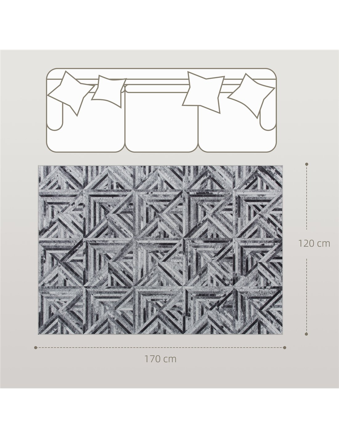 - A: The overall dimensions of the rug are 170 cm in length, 120 cm in width, and 0.5 cm in height.