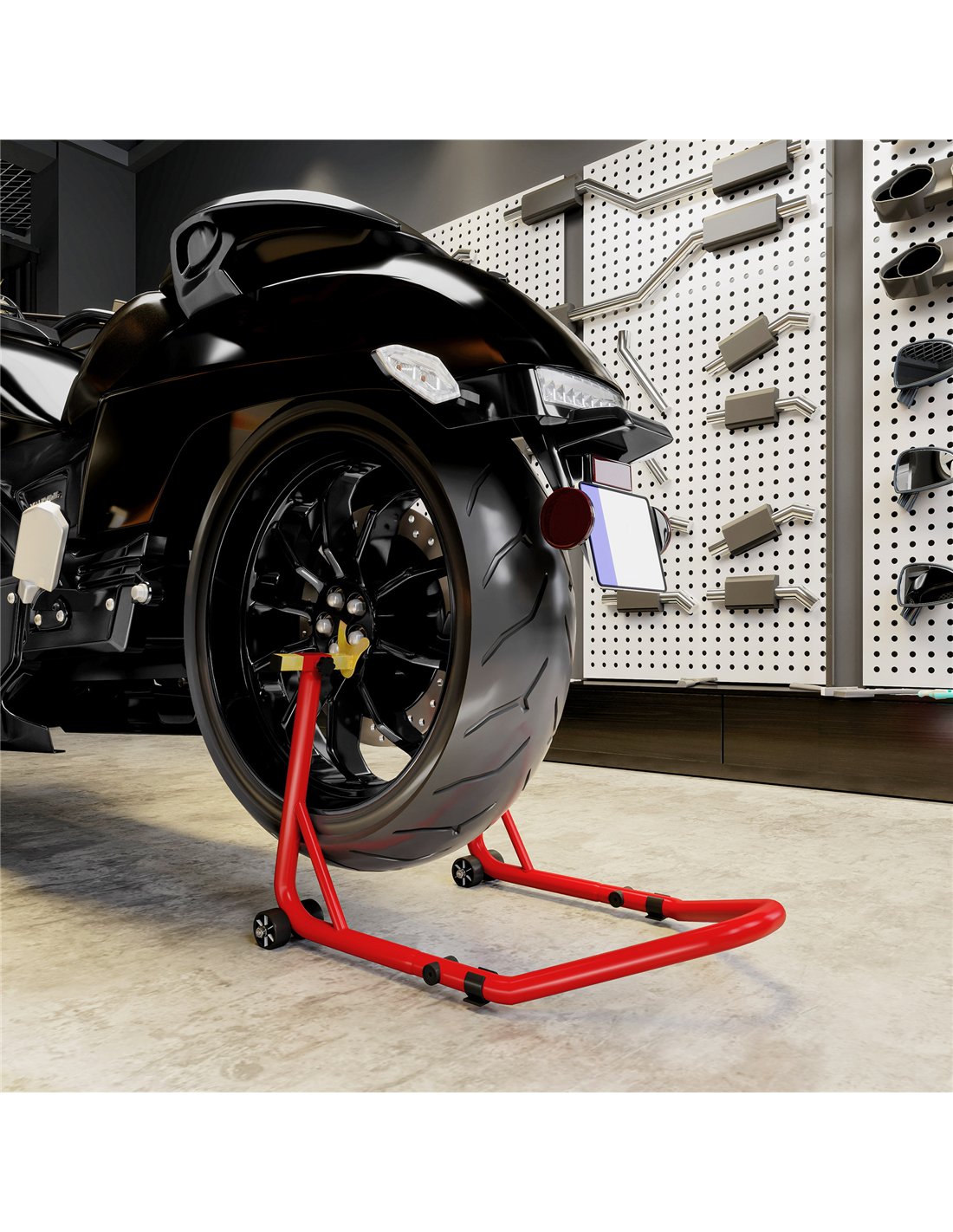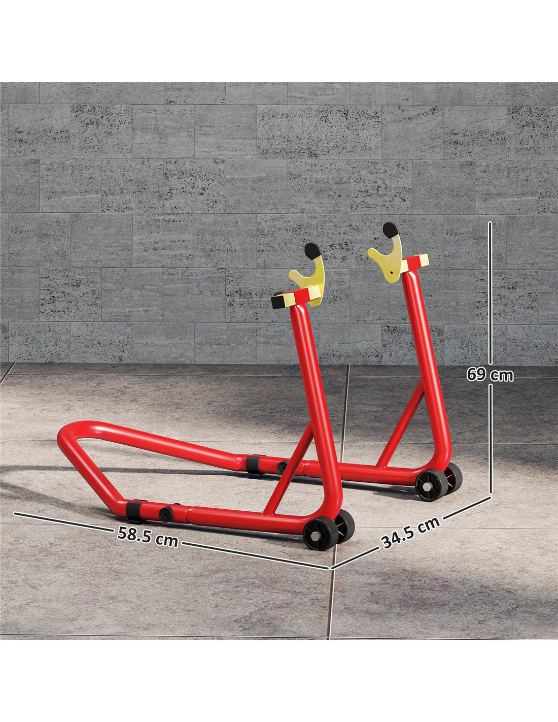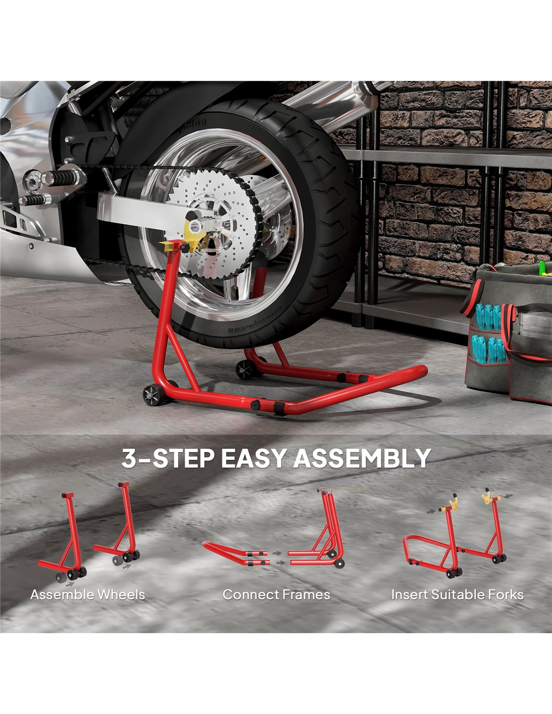The HOMCOM Motorcycle Rear Wheel Stand offers robust support for motorbike maintenance tasks. Built from 35mm thickened steel tubes, this heavy-duty paddock stand handles motorcycles up to 544 kg. It provides a stable platform for repair, cleaning, or storage in your workshop or garage. The stand includes adjustable U-shaped forks, fitting wheel sizes from 300-400 mm, and adjustable L-shaped forks, suitable for 310-380 mm, ensuring broad compatibility. Four heavy-duty wheels aid effortless positioning and movement. Integrated non-slip pads safeguard your garage or workshop floors from marks. This red stand delivers stability and convenience, simplifying your bike's upkeep. A large handle aids operation. Simple assembly means you begin work quickly. This stand ensures your motorcycle remains secure during servicing.