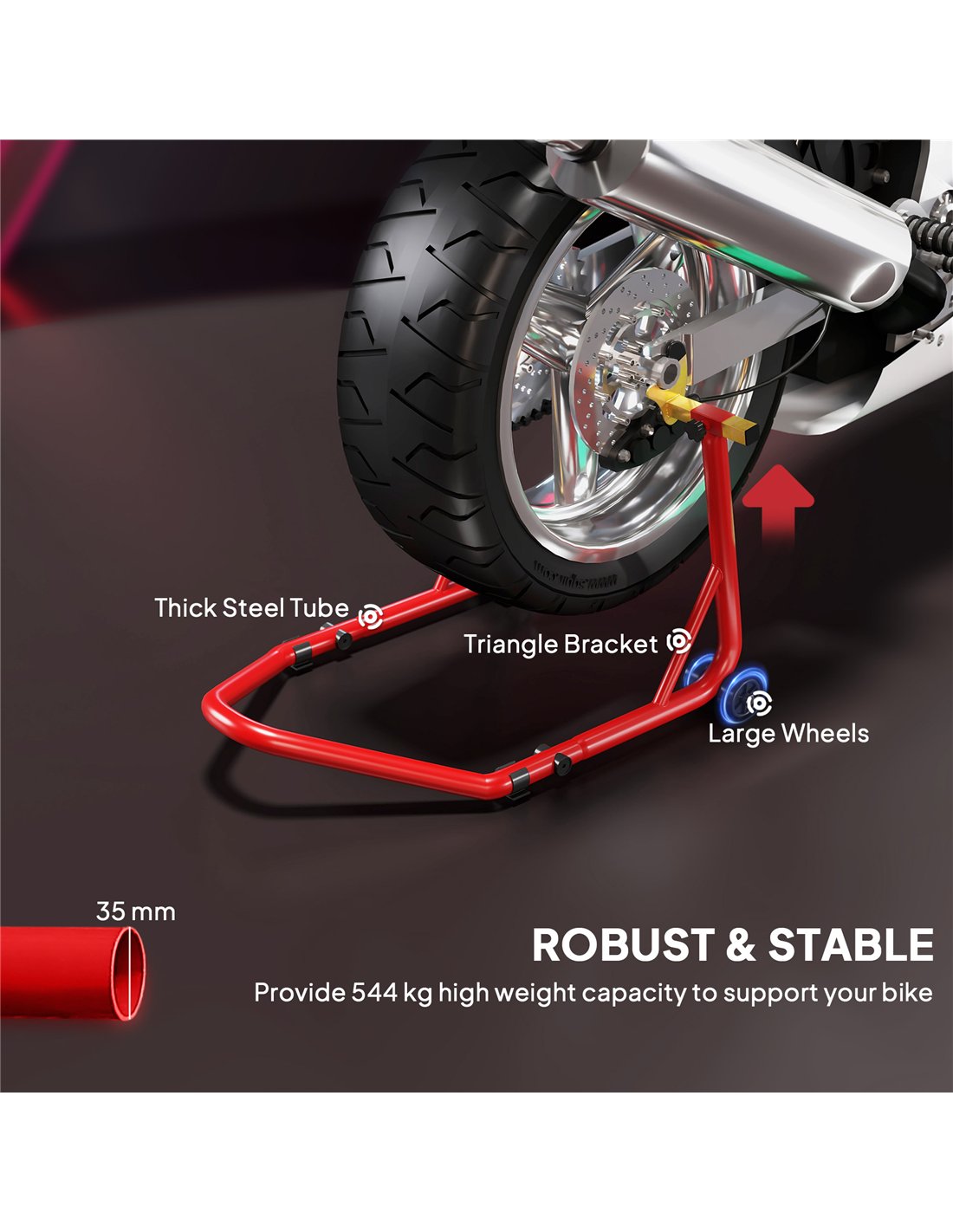 - A: The HOMCOM Motorcycle Rear Wheel Stand has a maximum weight capacity of 544 kg.