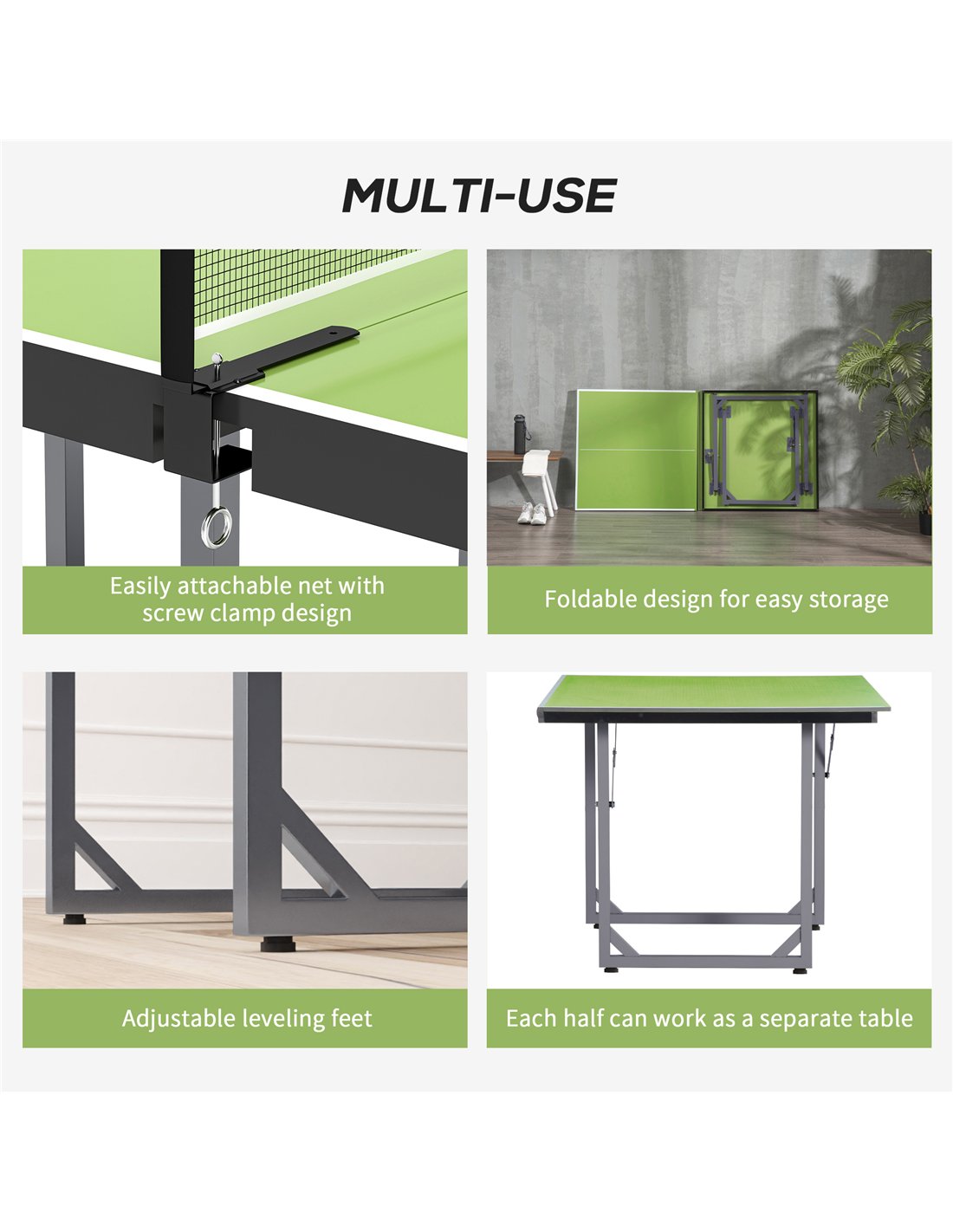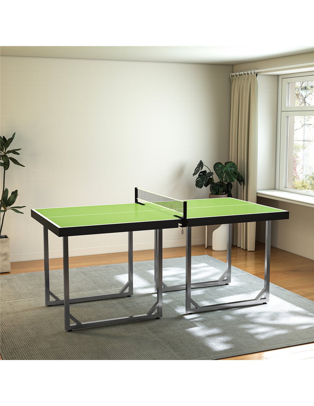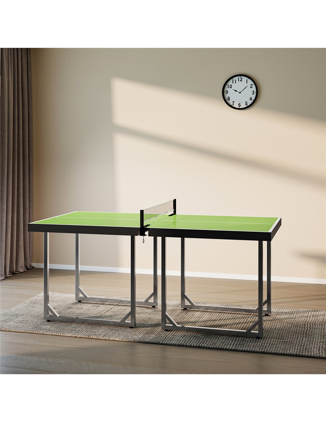 The HOMCOM 6ft Table Tennis Table offers an ideal solution for table tennis enthusiasts in the UK with limited space. This midsize green ping pong table provides authentic gameplay. It features a regulation height of 76 cm and a generous playing surface measuring 182 x 91 cm. You get a genuine table tennis experience without requiring extensive room. This portable ping pong set is designed for both indoor and outdoor use. Enjoy active fun in your home, office, or garden. Its clever design means no assembly is needed; unfold and play immediately. Each half folds into a compact square for easy storage. You can even use the separate halves as versatile game or craft tables. A robust metal frame ensures stronger durability and stability for long-term enjoyment. A net rack and net are included, providing a complete ping pong set for instant play.