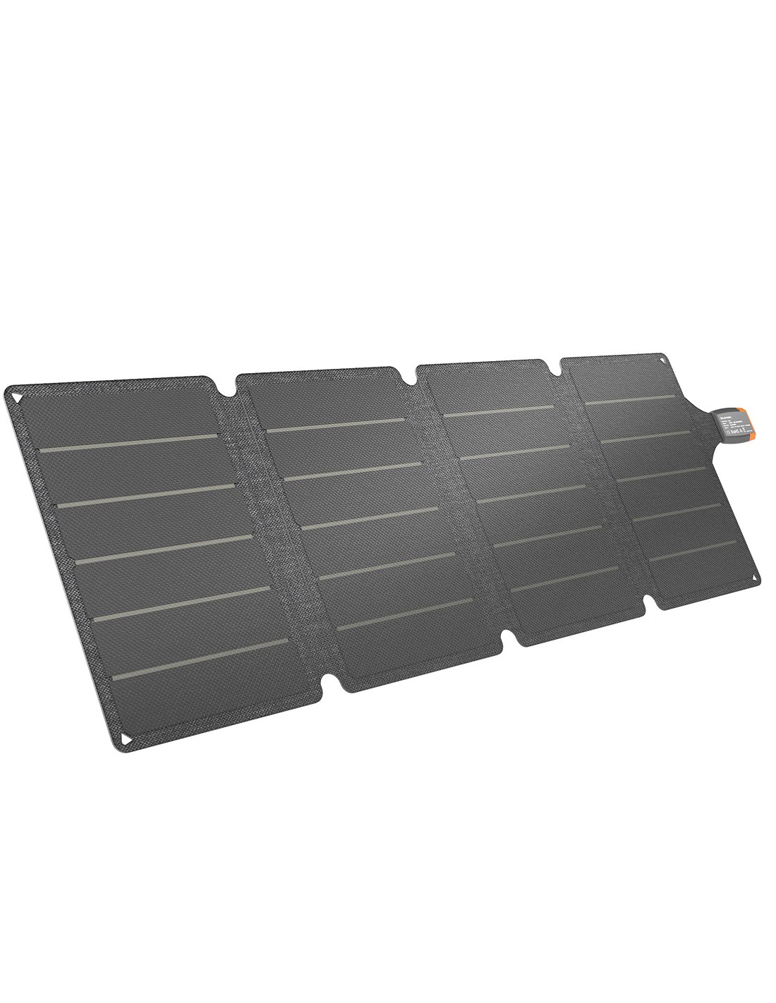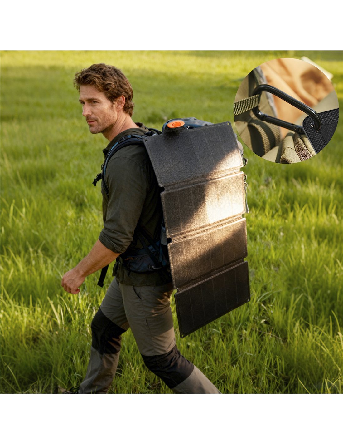 - A: This solar panel folds compactly to 27.9L x 20W x 3.05H cm, similar to a magazine. It is ultra-lightweight and includes carabiners, allowing you to easily hang it on your backpack for hands-free charging.