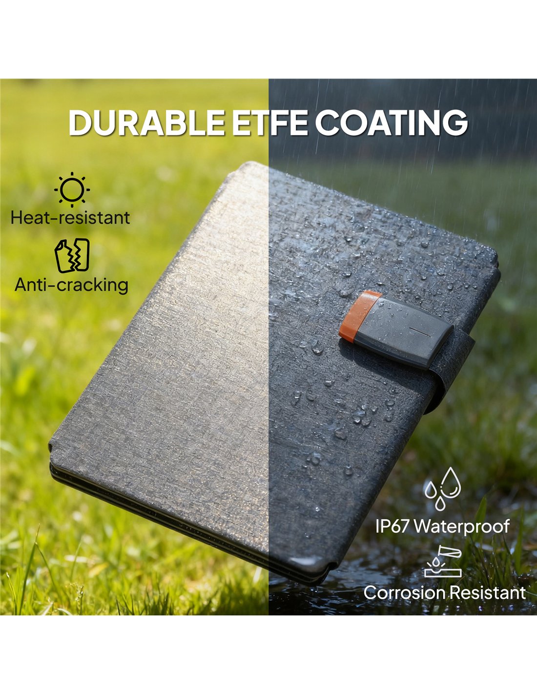 Designed for robust outdoor use, this solar panel features an IP67 waterproof rating. This protects it from rain and dust, ensuring consistent performance. The ultra-lightweight design folds compactly, allowing easy attachment to your backpack with the included carabiners. An ETFE surface ensures durability and sustained high conversion efficiency of 24.6%. The bright orange junction box offers clear visibility. Power your adventures across Great Britain with confidence and sustainable energy.