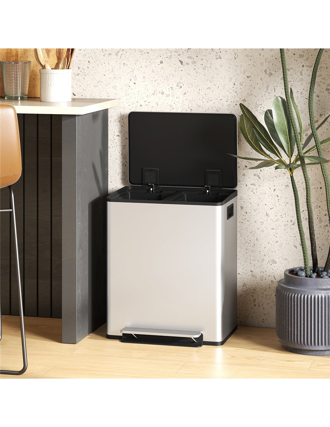 The HOMCOM 50L Dual Compartment Stainless Steel Bin in Silver offers an efficient waste management solution for your home. This robust kitchen bin features two 25-litre compartments, enabling easy separation of waste or recycling. Constructed from durable stainless steel, it provides a sleek, polished finish that resists fingerprint marks, maintaining a clean appearance. Integrated deodoriser holders within the lid ensure fresh-smelling surroundings. Operate the bin effortlessly with its pedal mechanism. The lid also includes a stay-open function, simplifying waste disposal and cleaning. Removable inner buckets, complete with a bag-fixing hole, make liner changes straightforward. This bin combines practical design with lasting quality, ideal for any modern UK household seeking organised and hygienic waste solutions.