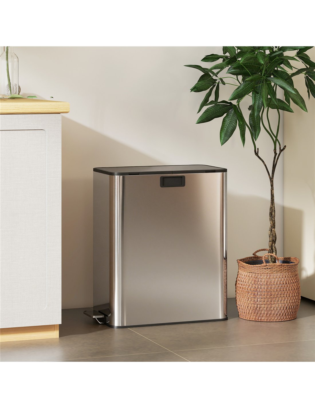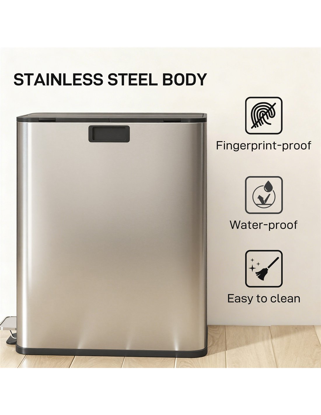 This HOMCOM Dual Kitchen Bin provides an efficient waste management system for any UK home. Featuring two 28L compartments, it streamlines your recycling and general waste sorting. The robust stainless steel pedal bin boasts a soft-close butterfly lid, ensuring quiet operation and a maximum opening height of 81 cm to fit under most countertops. Its fingerprint-proof silver tone finish keeps the bin looking clean and smudge-free with minimal effort. Both inner buckets are removable and include bag holders, making waste disposal and cleaning straightforward. This modern, hygienic design integrates seamlessly into kitchens, offices, or study rooms. No assembly is required, allowing for immediate use. Upgrade your space with this convenient and stylish waste solution.