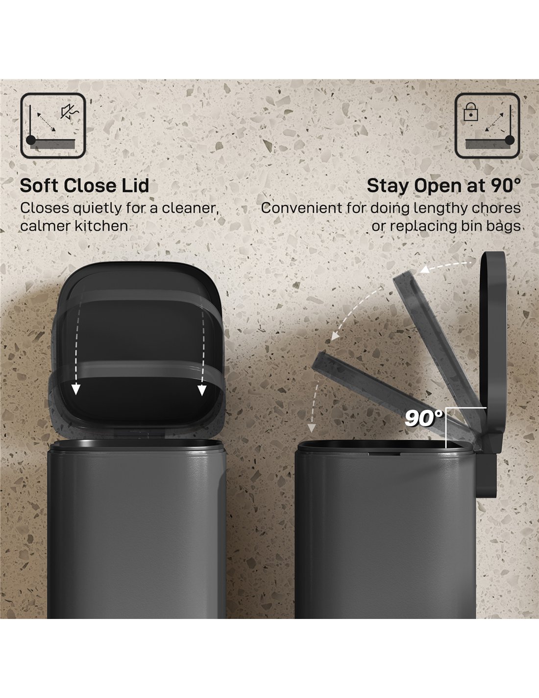 - A: Yes, the bin features a soft-close lid for silent operation. It also has a stay-open function for convenience during use.
