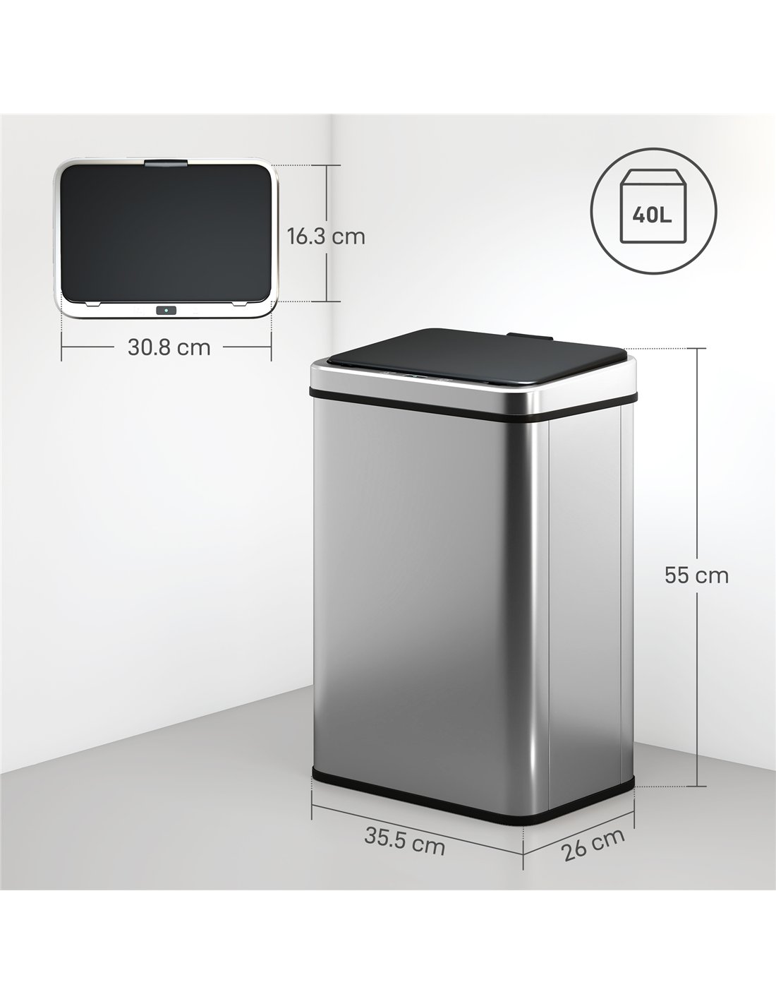 - A: The HOMCOM sensor bin has an overall dimension of 35.5L x 26W x 55H cm and a capacity of 40 litres.