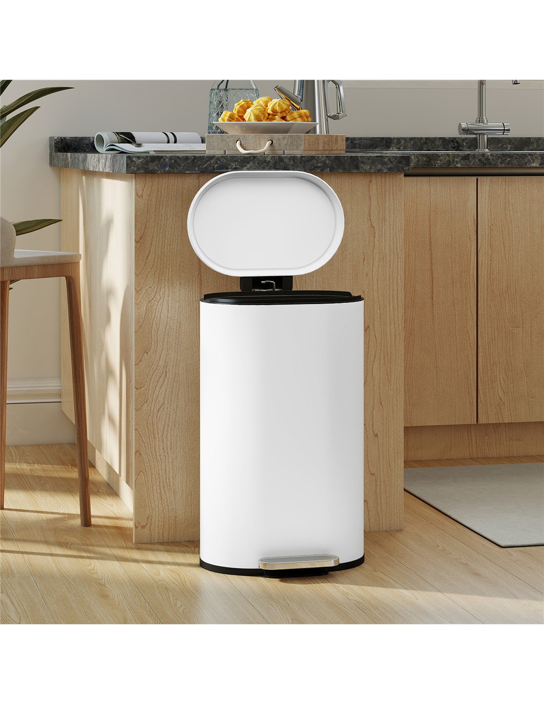 Elevate your kitchen's functionality and aesthetic with the HOMCOM 30 L Modern Curved Kitchen Bin in White. This essential pedal bin offers a 30-litre capacity, making it suitable for busy households or office spaces. Crafted from robust, fingerprint-resistant, powder-coated metal, its sleek curved design complements any modern decor. The silent soft-close lid operates smoothly, preventing noise and maintaining a quiet environment. Its stay-open feature holds the lid at a 90° angle, simplifying waste disposal and bin bag changes. A removable inner bucket includes a dedicated ring to secure bin liners, ensuring cleanliness and ease of use. This durable, space-saving bin provides everyday convenience without requiring any assembly.