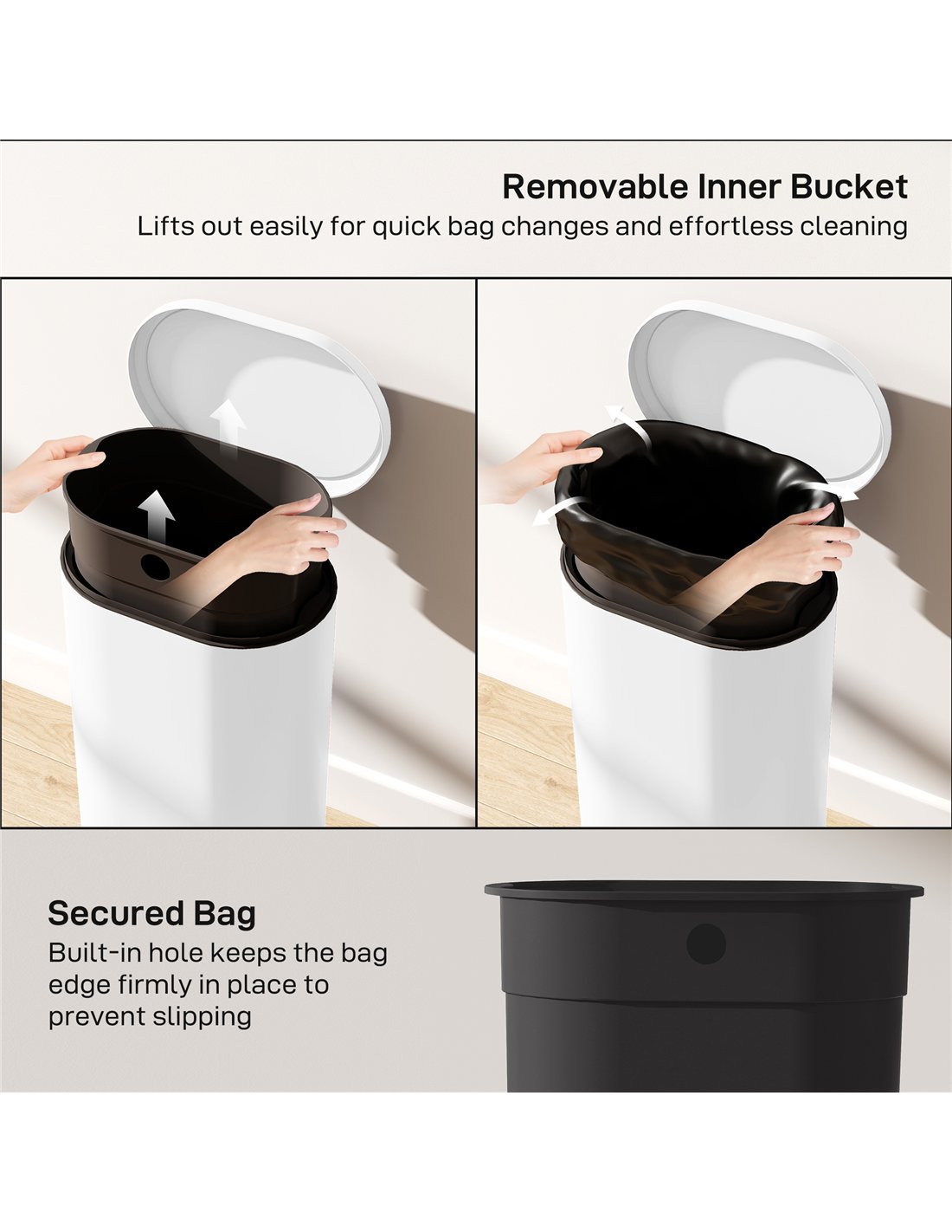 - Removable inner bucket with bin bag ring to hold in place
