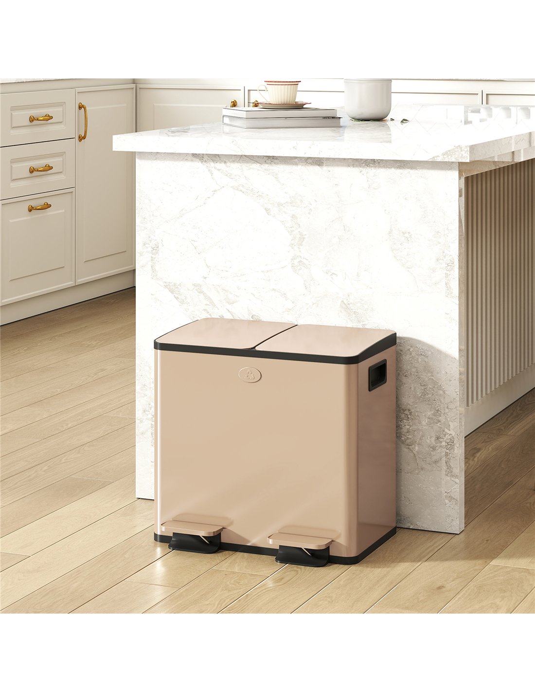 Optimise your kitchen hygiene with the HOMCOM 30L Dual Compartment Stainless Steel Bin, presented in a sophisticated gold tone. Designed specifically for UK households, this bin offers efficient waste sorting with its two 15-litre sections, totalling 30L capacity. Crafted from durable 410 stainless steel, it provides a robust, polished finish that resists fingerprint marks, ensuring a consistently clean look. Practical deodoriser holders are built into the lid, helping to neutralise odours and maintain a fresh environment. Operate the lid effortlessly with a foot pedal for hands-free convenience. A stay-open feature simplifies bag changes and thorough cleaning. Each inner compartment is removable and includes a practical hole to secure bin liners. Measuring 41.7L x 36.6W x 43.2H cm, this HOMCOM bin arrives fully assembled, ready for immediate use in your home.