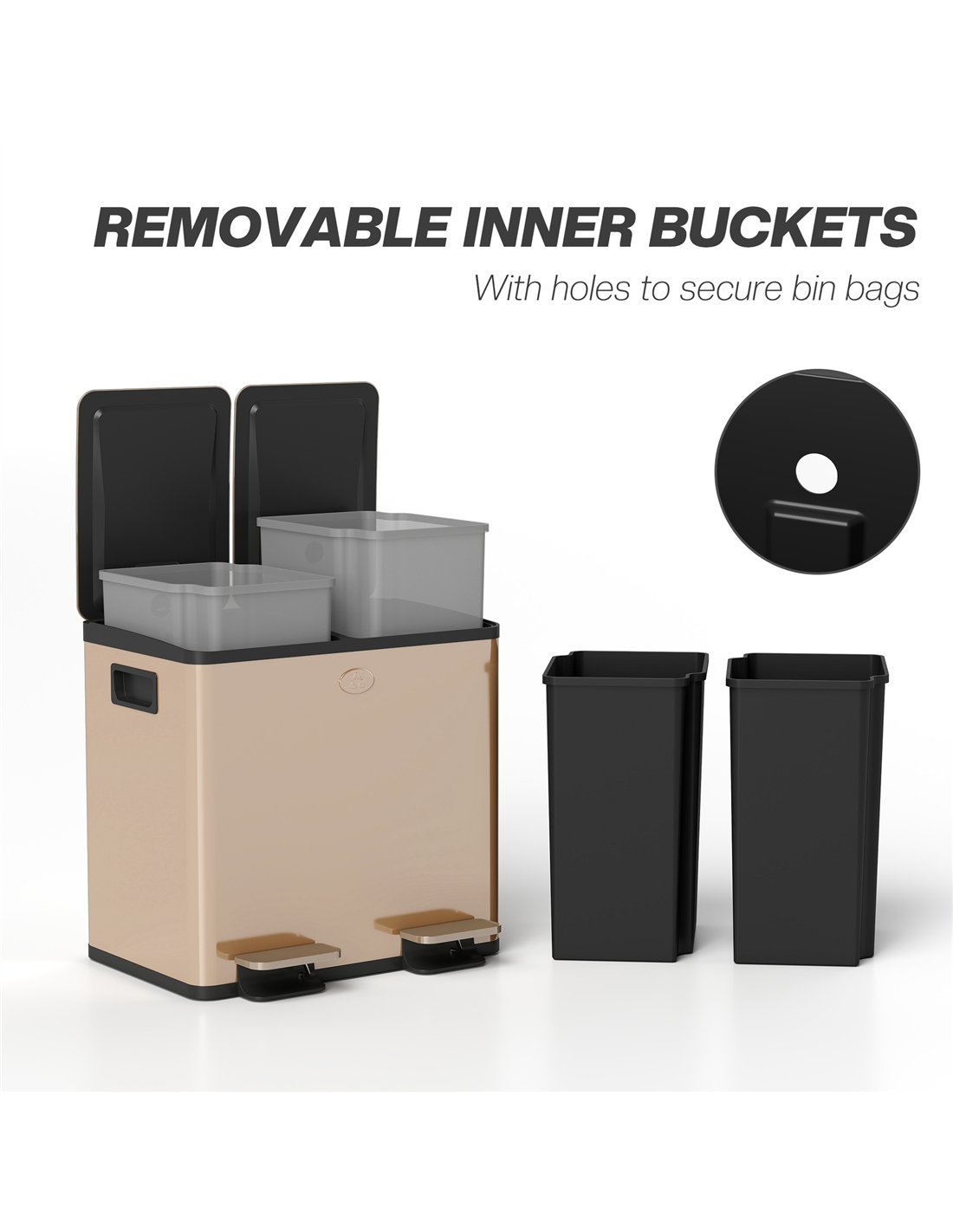 - Removable inner buckets, with a hole to fix bin bag for easy cleaning