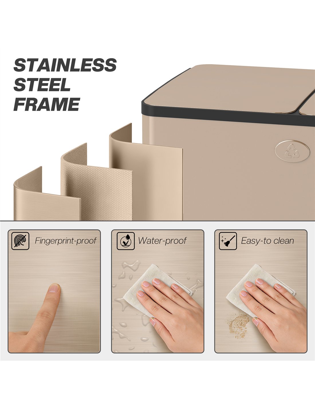 - A: The bin is constructed from 410 stainless steel and PP plastic, featuring a gold-tone finish.
