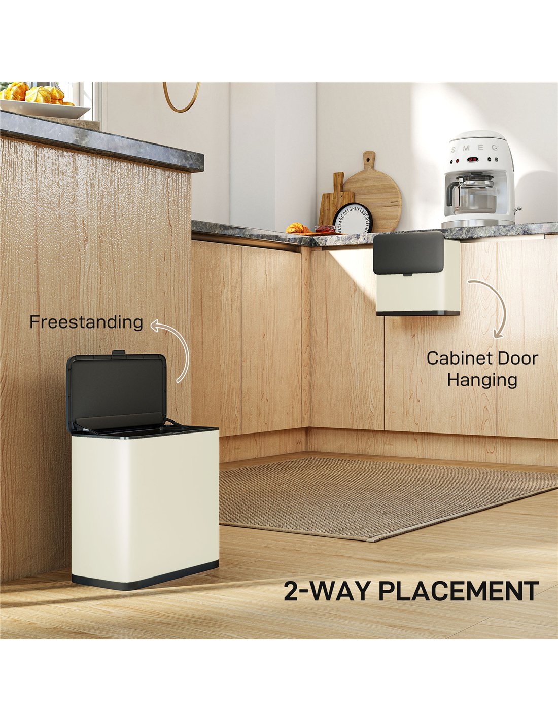 - A: The bin offers dual placement. You can hang it over a kitchen cabinet door, suitable for doors up to 3cm thick. Alternatively, use it as a freestanding bin under your sink, in an office, bedroom, or study room. A manual is included to guide setup.