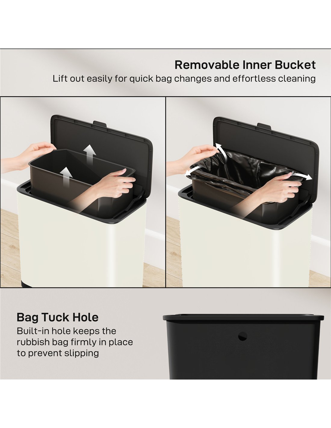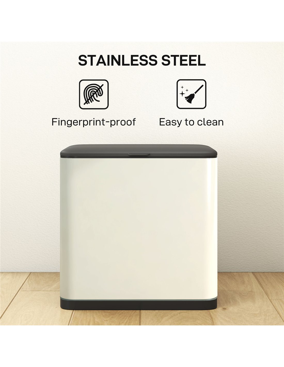 - A: The bin is available in Cream White and Black colours. It features a timeless brushed stainless steel finish that resists fingerprints.