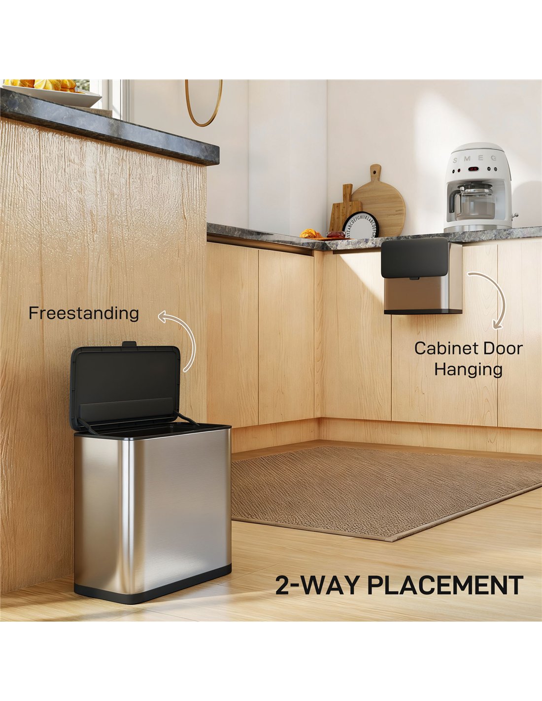 - A: Yes, this bin offers dual placement versatility. You can use it free-standing, hang it over a cabinet door, or position it under a sink. The maximum door thickness for the hook is 3 cm.