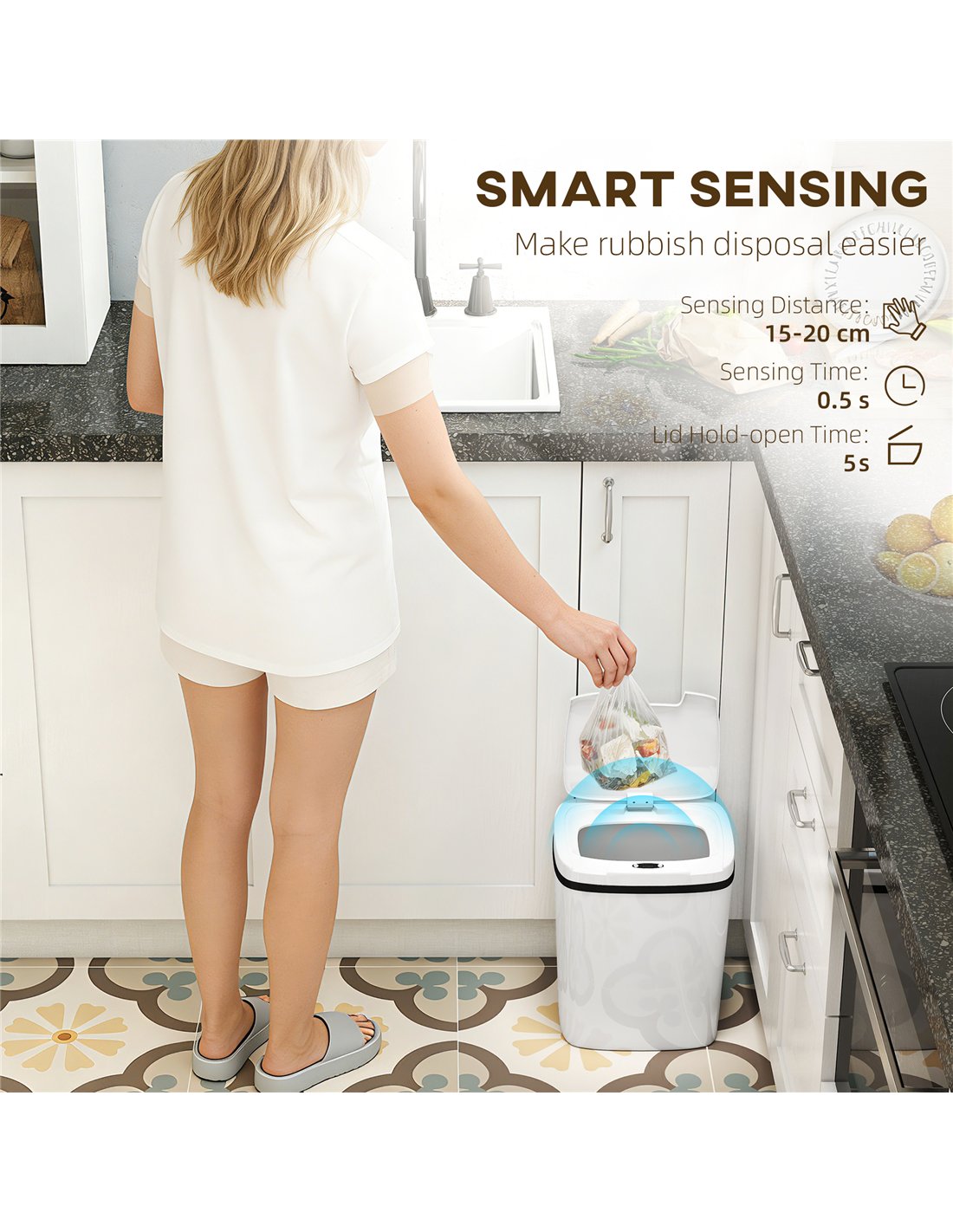 HOMCOM 15L Sensor Bin, Automatic Touchless Kitchen Bin, Easy Clean, Battery Operated for Home Office, Bedroom, Bathroom, White