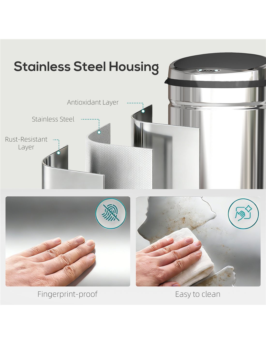 - A: The bin is constructed from stainless steel, ABS, and PP. The stainless steel body is brushed, fingerprint-resistant, and wipes clean easily.