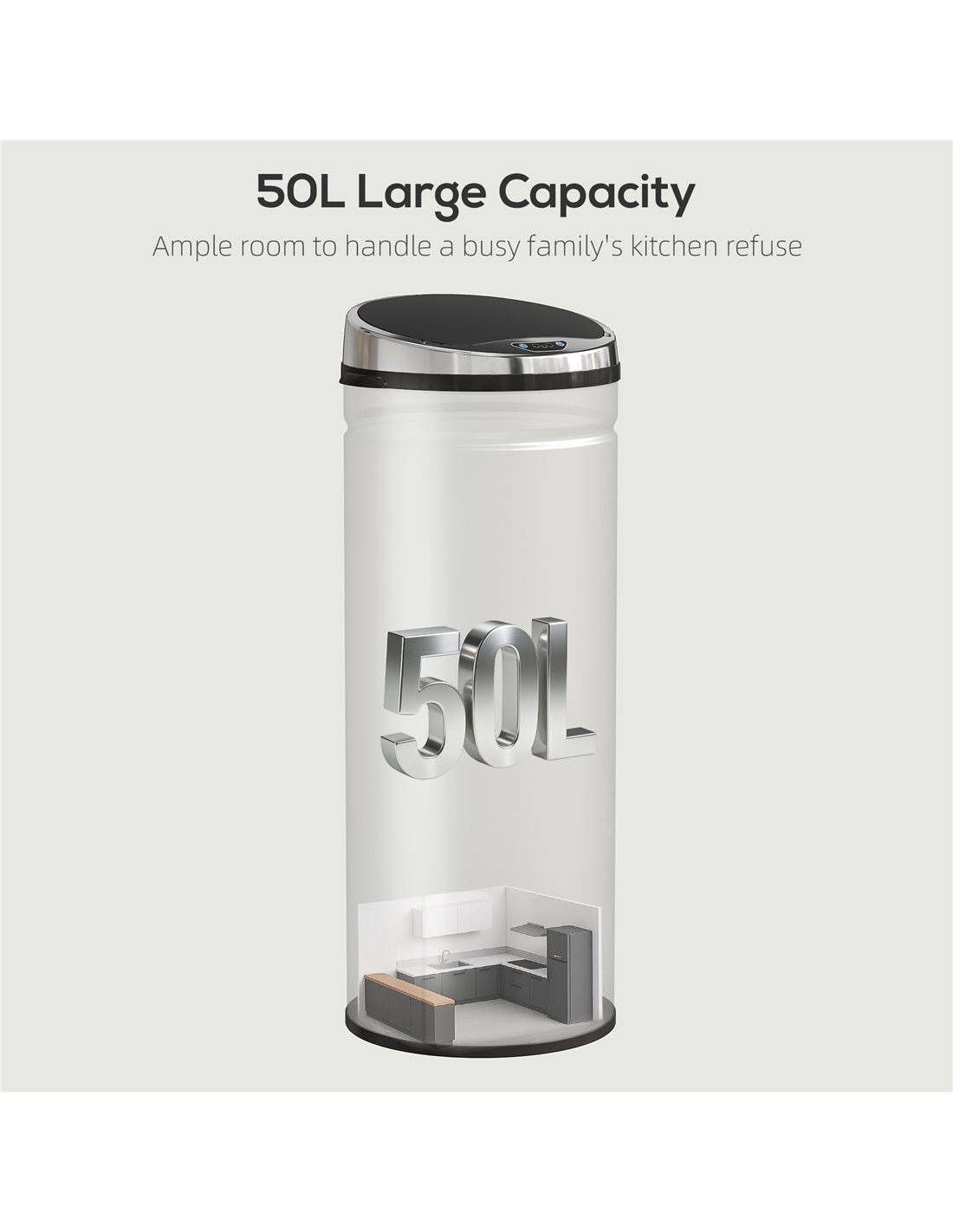 - A: This HOMCOM sensor bin has a large 50-litre capacity, designed to hold more waste and reduce the frequency of emptying.