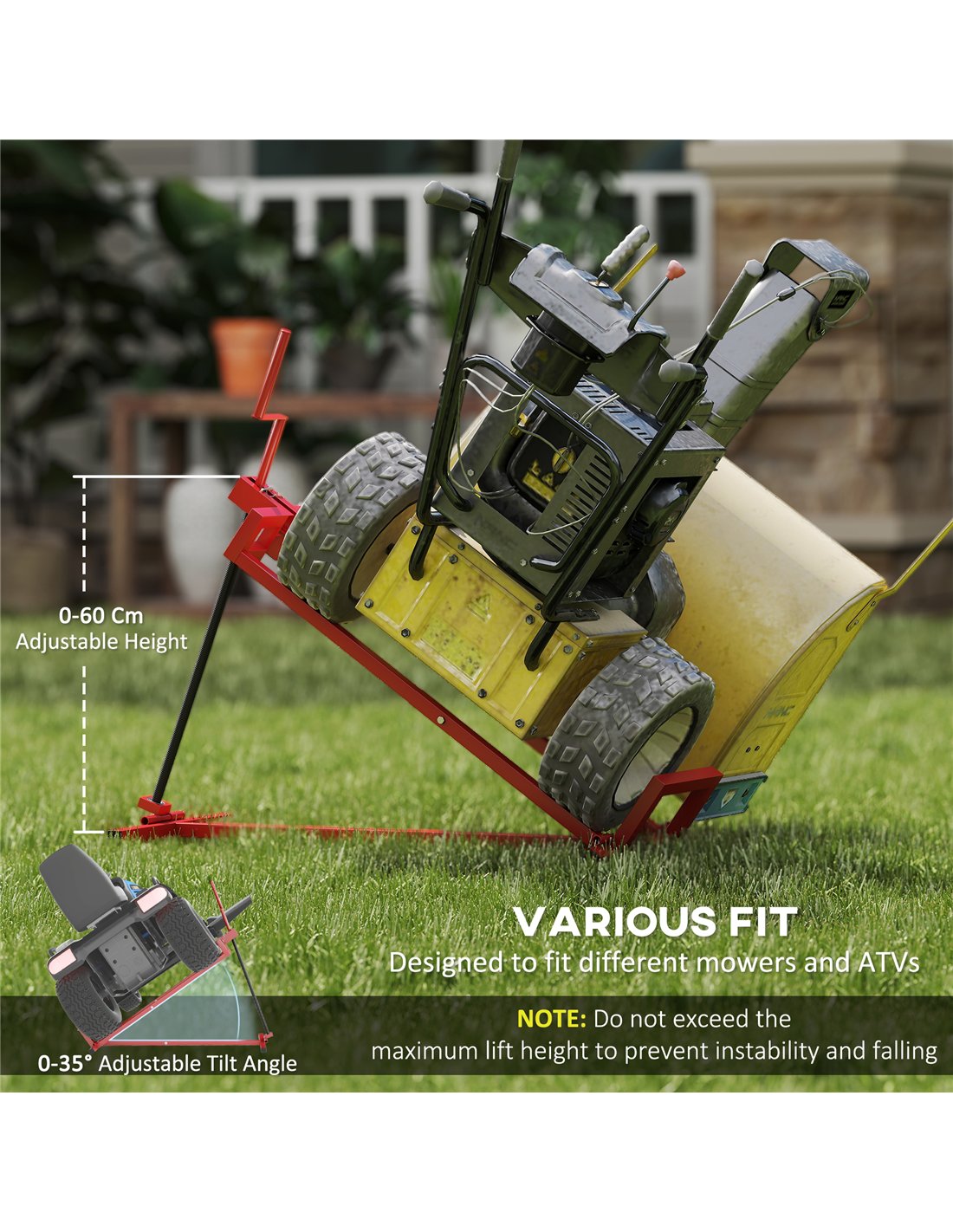 Maintain your ride-on mower or ATV with confidence using the HOMCOM 400 kg Foldable Mower Jack Lift. This robust red steel lifting device supports up to 400 kg, ensuring safe and stable operations for your garden equipment. Adjust the height from 0 to 60 cm and tilt up to 35 degrees, providing optimal access for all maintenance tasks. This adjustable design suits various models and allows comfortable working angles. The integrated safety pin enhances security during use. When finished, simply fold the jack lift for compact storage or easy transport. This HOMCOM device simplifies routine cleaning and essential servicing, making vehicle upkeep straightforward and secure.Features: