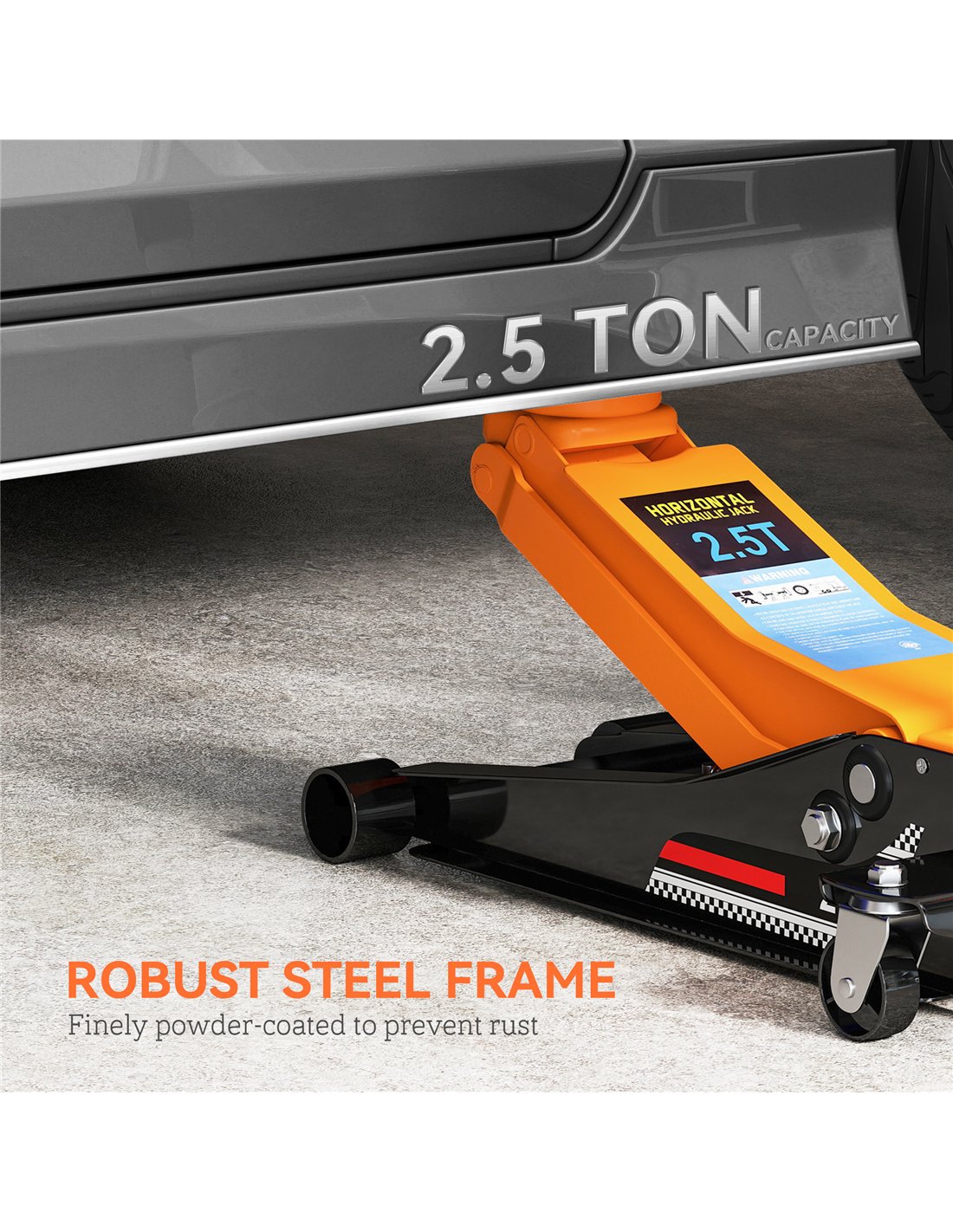 - A: The HOMCOM 2.5 Ton Hydraulic Low-Profile Floor Jack supports a weight capacity of 2.5 tonnes. It offers a lifting range from 7.5 cm up to 47 cm, accommodating different vehicle heights.