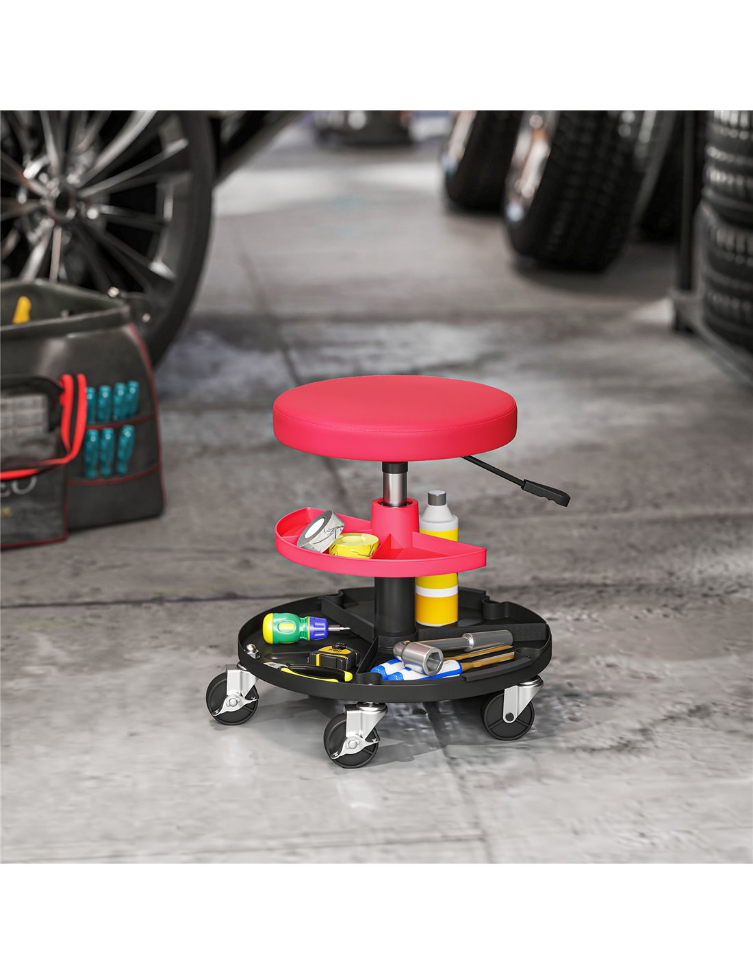 Optimise your workspace with the HOMCOM Rolling Mechanic Stool. This workshop stool, designed for garages, shops, and auto repair, provides stable support for users up to 135 kg. Its robust steel frame ensures lasting durability for demanding tasks. Experience adaptable working positions with pneumatic height adjustment, ranging from 40 to 51 cm, reducing knee stress during long projects. The scratch-resistant leather seat, paired with a thick cushion, provides essential comfort, combating fatigue. Navigate your work area with ease using five 360° swivel casters; two casters include brakes for secure positioning. Integrated dual-tier tool trays keep your essential items organised and accessible, enhancing efficiency. This red mechanic stool is a practical addition for any professional or enthusiast in the UK, improving workflow and comfort.