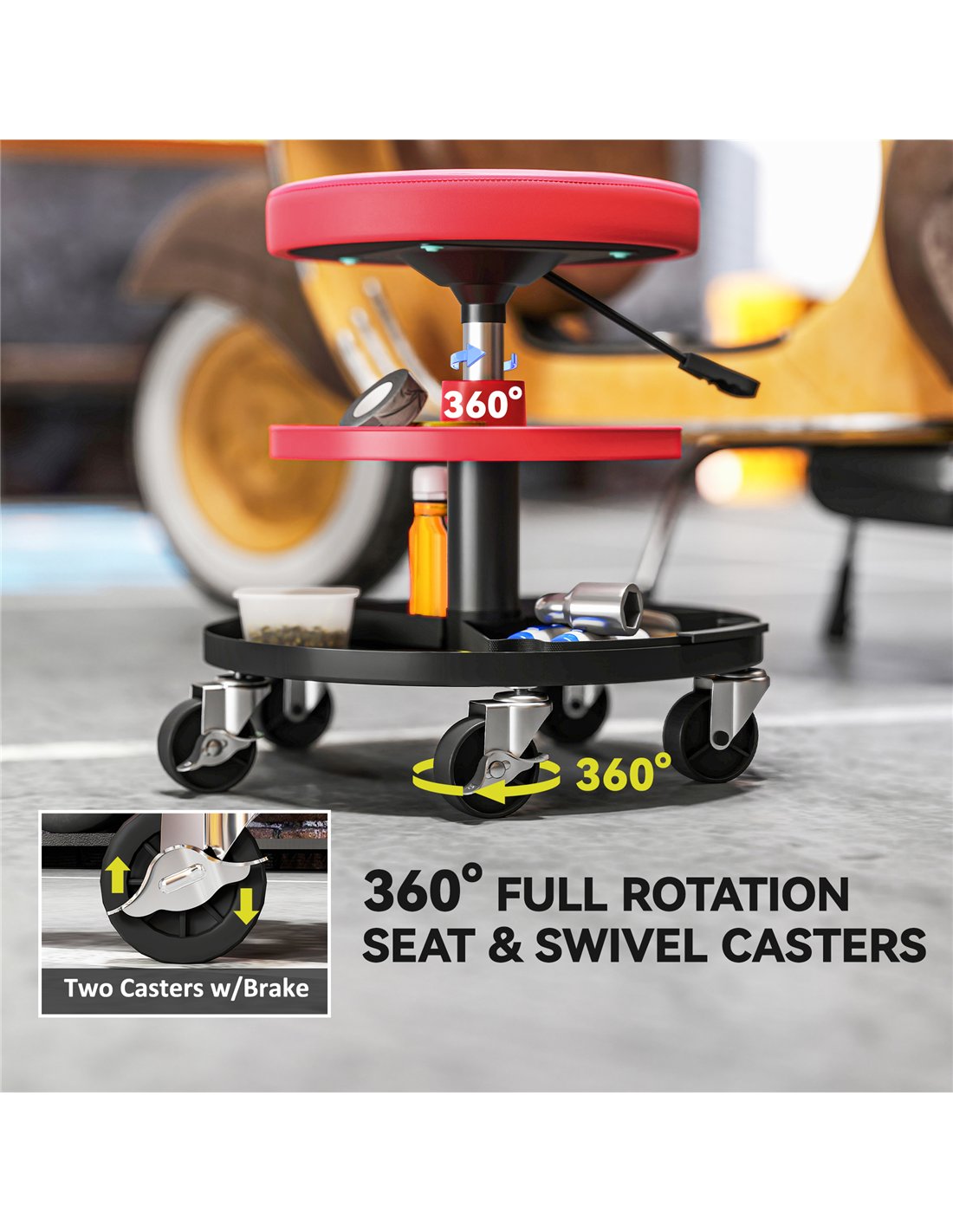 - A: The stool comes with five 360° swivel casters for effortless movement. Two of these casters have brakes to secure the seat in place.