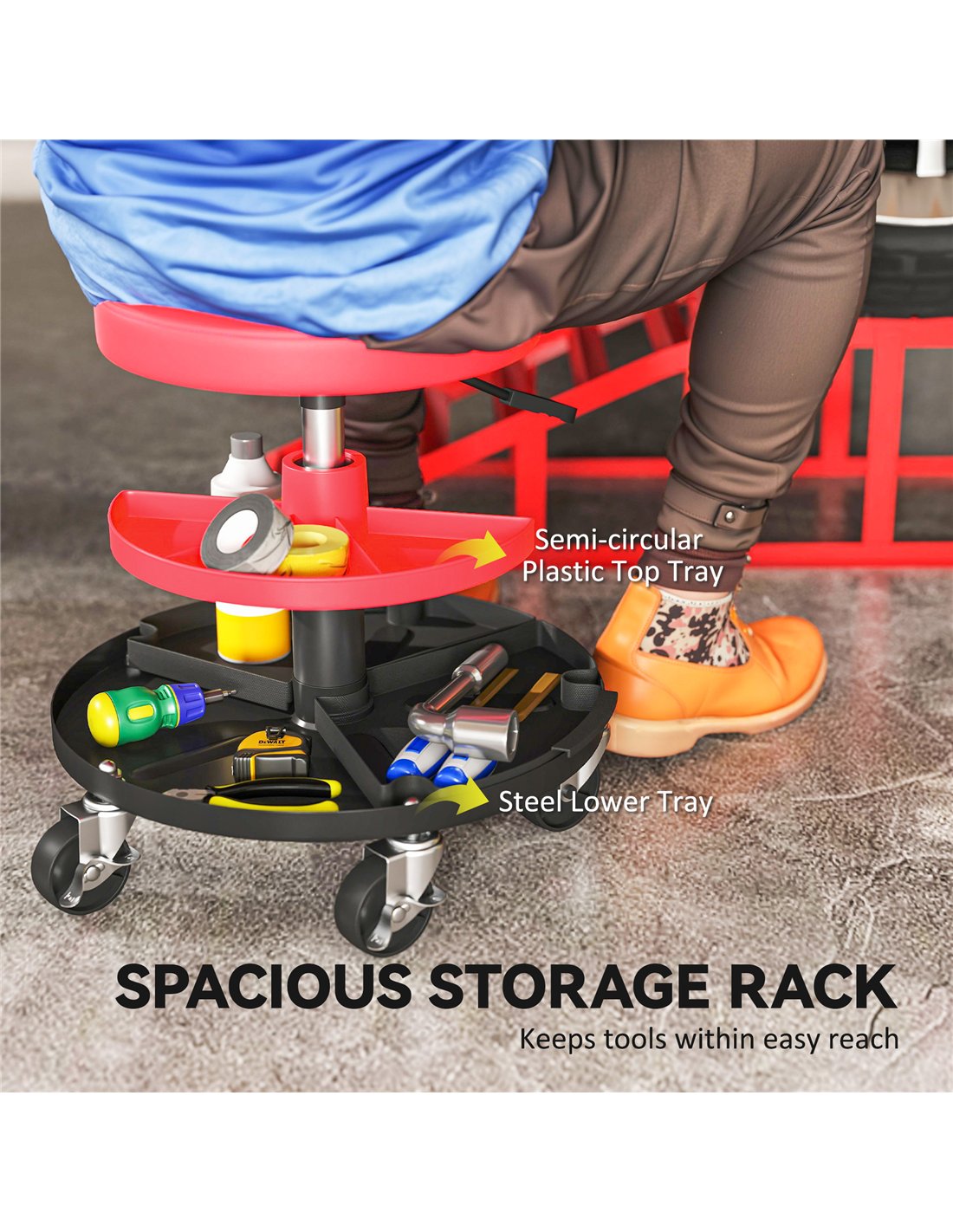 HOMCOM Rolling Mechanic Stool, 135kg Capacity Workshop Stool, 360° Swivel Roller Padded Creeper Seat with Wheels, Tool Trays Storage for Garage, Shop, Auto Repair, Red
