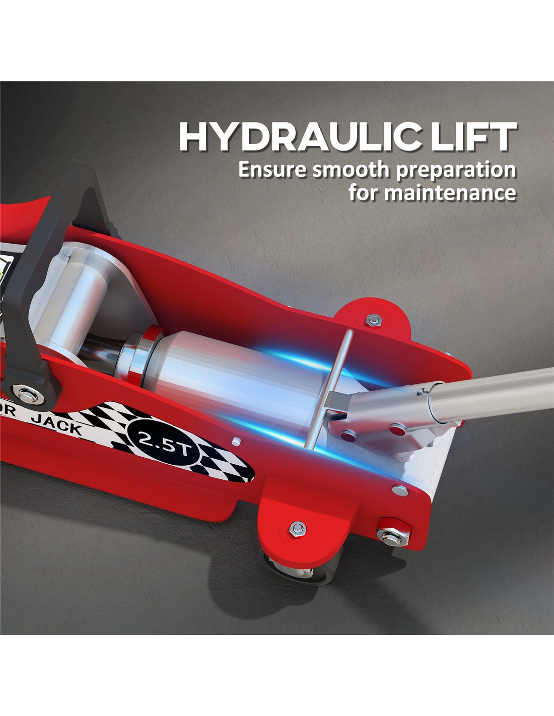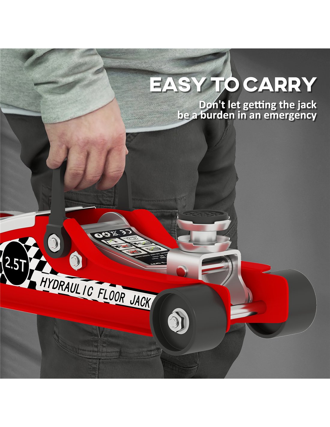 HOMCOM Hydraulic Low Profile Floor Jack, 2.5 Tonne Heavy Duty Steel Trolley Car Jack Lift with 80-360 mm Lifting Range, Wheels, Top Handle, Red