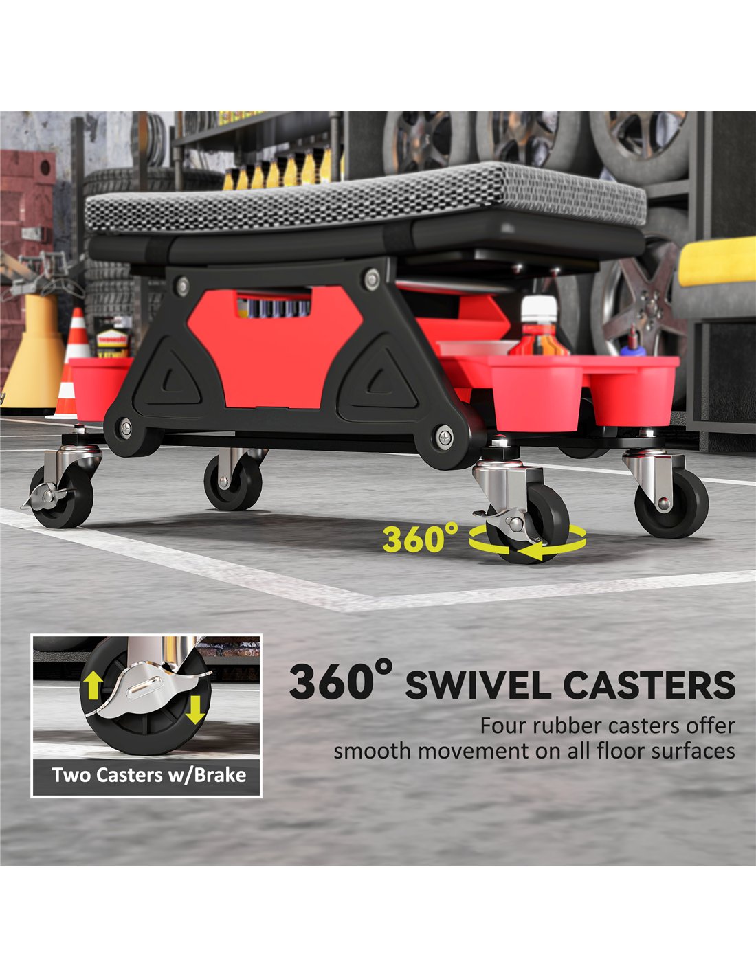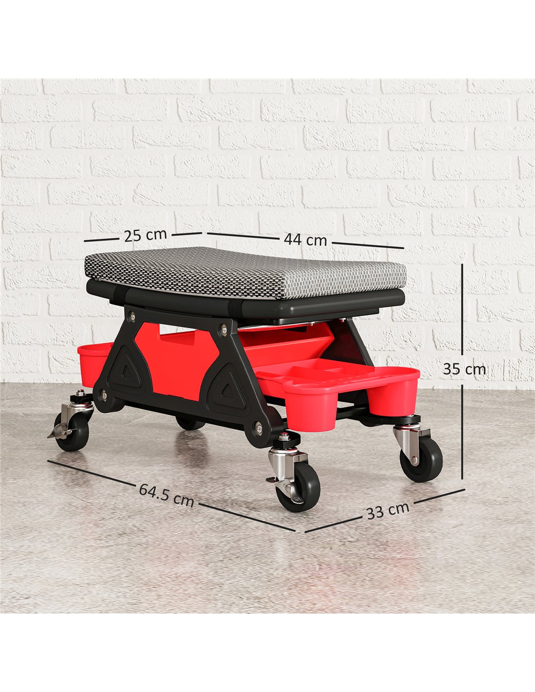 Optimise your workflow with integrated storage. This creeper seat includes two partitioned tool trays and a large drawer, keeping all your equipment within easy reach. The 360° swivel seat allows full range of motion. Finished in black, this mechanic stool measures 64.5W x 33D x 35H cm, making it a compact yet highly functional addition. Work efficiently and comfortably with this HOMCOM workshop solution.