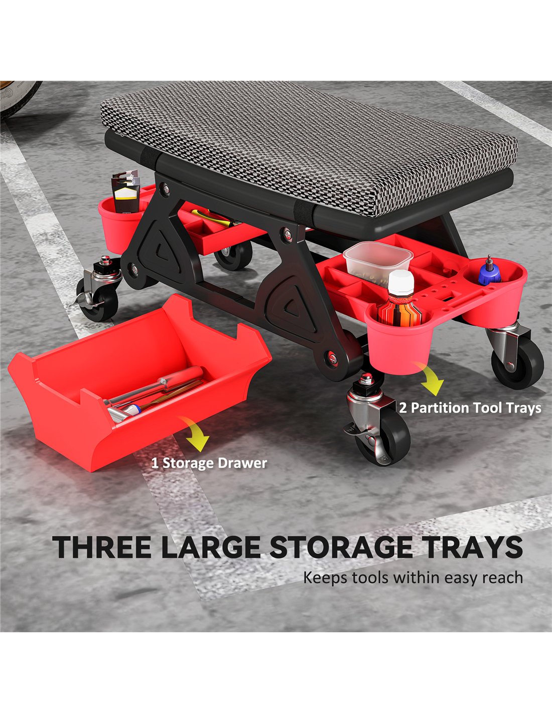 - A: The stool includes two partitioned slide-out tool trays and a large storage drawer. These features keep your tools organised and accessible.