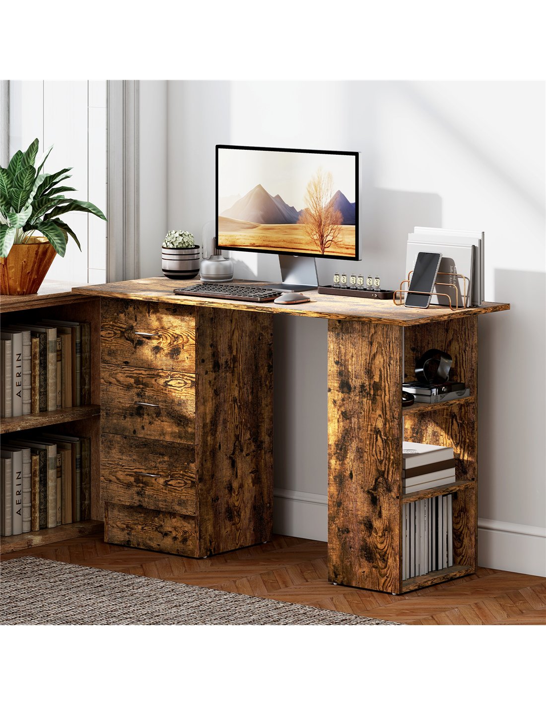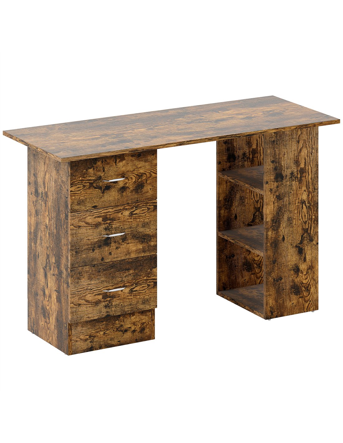 Upgrade your workspace with the HOMCOM Computer Desk, a versatile solution for home office and study needs across the UK. FastDaddy offers this rustic brown writing table, meticulously designed to support your working and learning activities. Constructed from robust MDF, this PC workstation delivers a contemporary and minimalistic aesthetic, fitting seamlessly into various interior styles. Measuring 120W x 49D x 72H cm, the spacious table top provides significant room for your computer, peripherals, and study materials. Experience superior organisation with its integrated storage: three open shelves and three enclosed drawers. You customise the desk by installing the storage unit on either the left or right side, adapting it to your space and habits. Each drawer includes a convenient handle for smooth operation. This desk combines practical storage with a clean design, ensuring an orderly and productive environment for your daily tasks.Features: