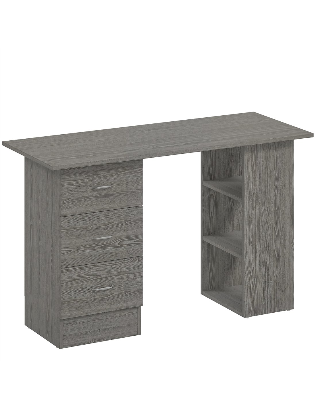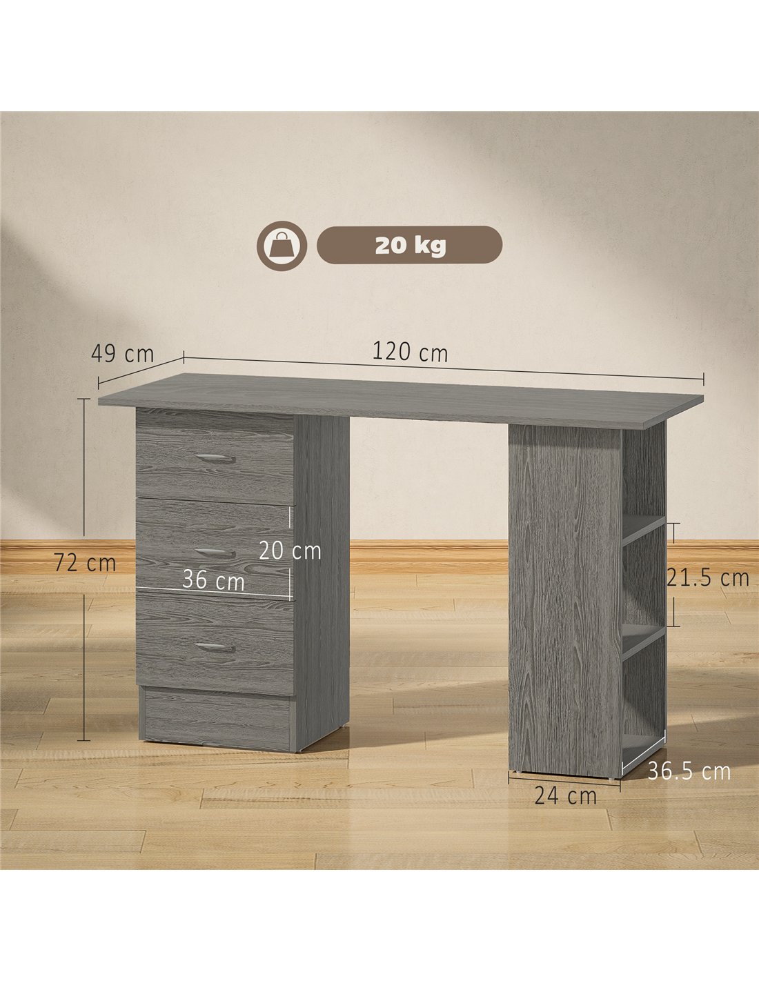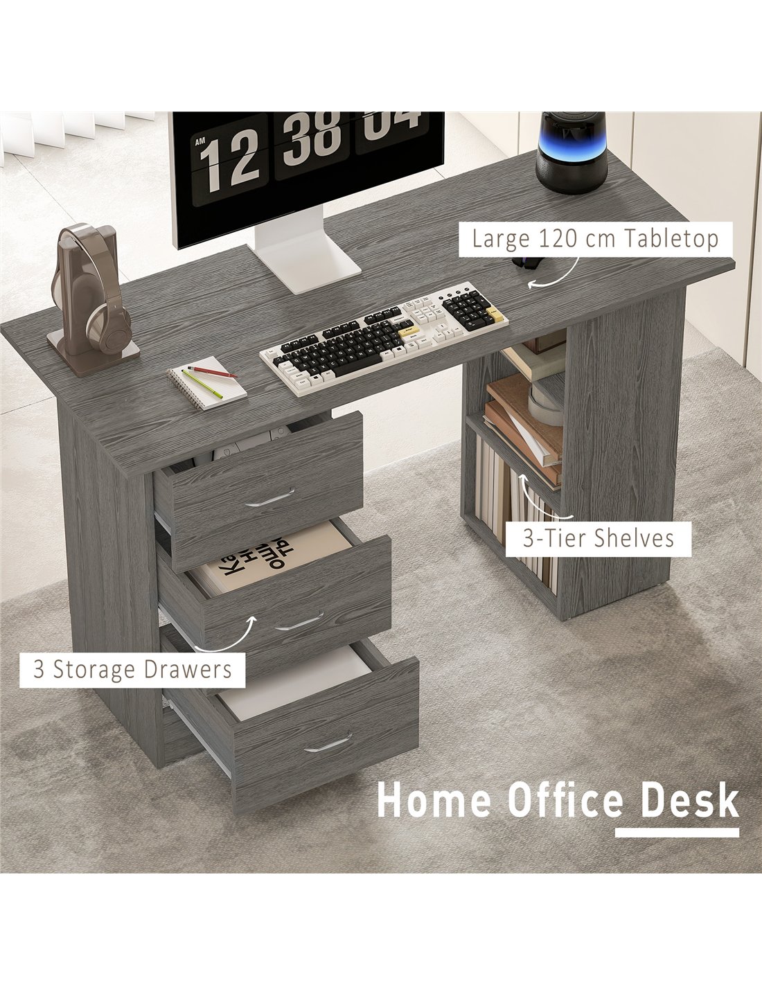Upgrade your home office with the HOMCOM Computer Desk, a practical solution for modern living. This grey desk, measuring 120W x 49D x 72H cm, provides a dedicated surface for working or studying. You have ample space for your PC, laptop, and other essentials. Constructed from durable MDF, this desk offers reliability for daily use in your study or workspace. It features three enclosed drawers and three open shelves, giving you versatile storage options. Position the drawers and shelves on either the right or left side to fit your room layout or personal preference. This design creates a balanced environment for organisation and productivity. Each drawer includes a handle for straightforward access. Maintain a tidy and efficient workstation with this essential piece, designed for the demands of the UK home.