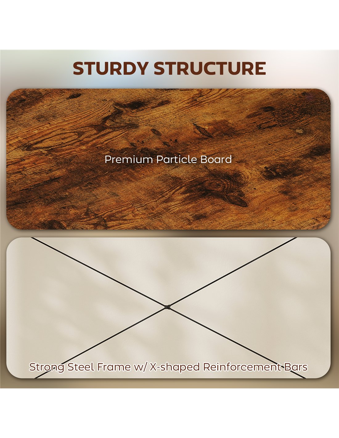 - A: The desk uses particle board with a melamined surface and a steel frame. This construction ensures it is long-lasting and easy to clean. The steel frame also features X-shaped reinforcement for a robust structure.