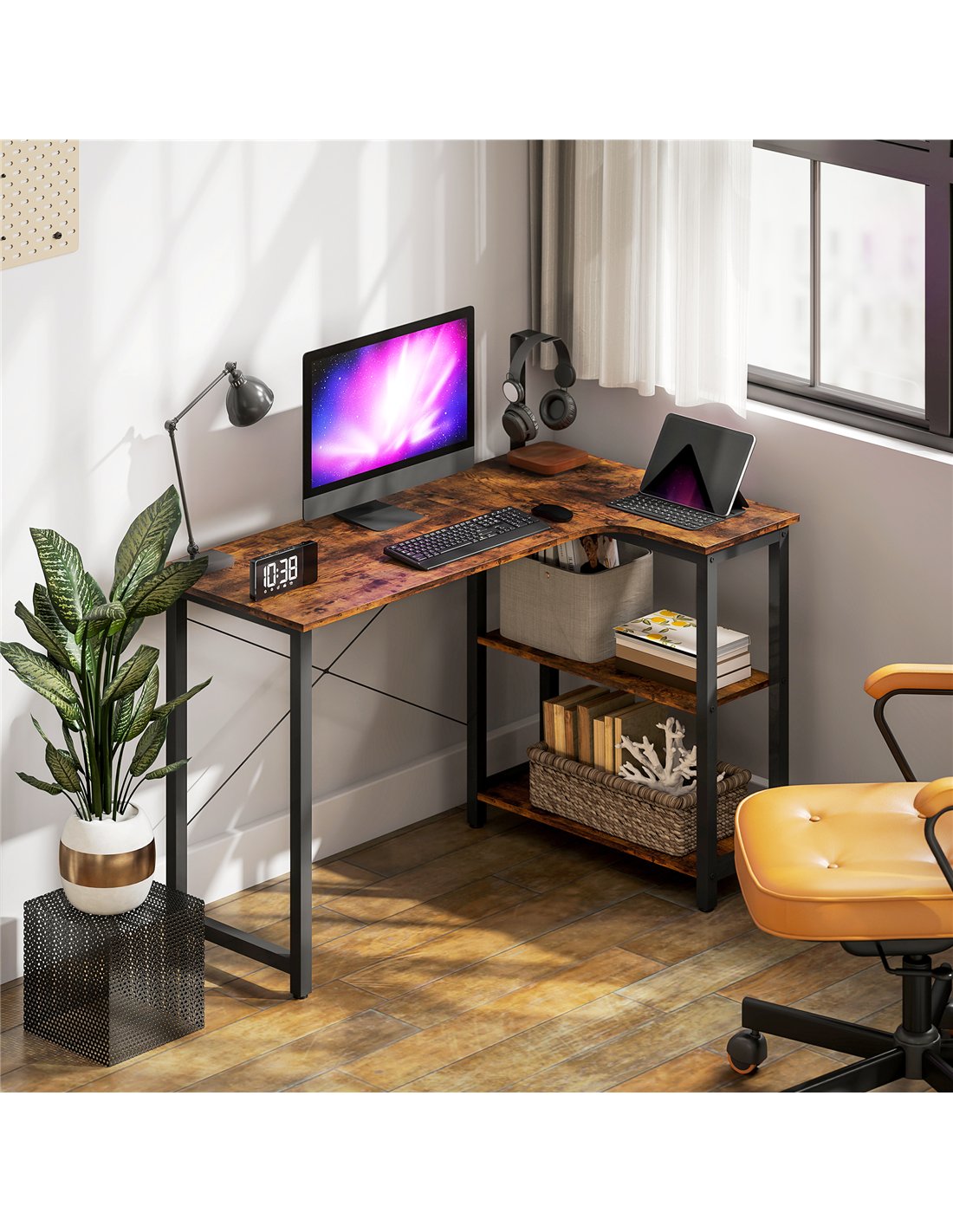 Optimise your workspace with the HOMCOM L Shaped Desk. This corner computer desk incorporates a functional bookshelf, perfect for any home office, study room, or workstation across the UK. It makes full use of often-ignored corner spaces, providing an ample surface for writing, computer work, and other essential activities. The rustic brown finish introduces a stylish element to your room. Your desk features durable particle board with a melamined surface. This ensures a long-lasting and simple-to-clean workspace. A sturdy steel frame includes X-shaped reinforcement poles at the back, confirming a robust structure. Adjustable footpads ensure stable standing and prevent floor scratches. Measuring 120W x 73.2D x 75H cm overall, this desk offers comprehensive storage and work area for your daily needs.