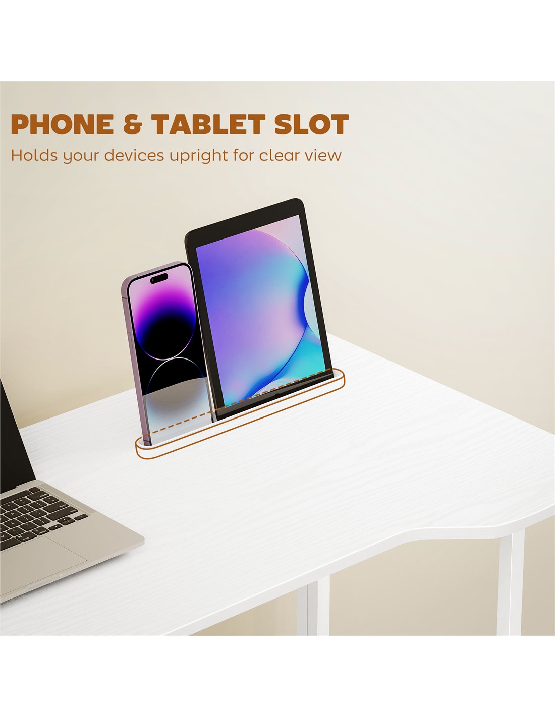 Maximise your living space with the HOMCOM Small Folding Desk. This white wood-effect desk provides a functional workspace for flats and smaller homes across the UK. It offers a stable, reliable surface, addressing common frustrations with cramped areas or unstable makeshift tables. The desk features smooth-locking wheels, allowing effortless movement to any desired location. When work concludes, its clever design enables quick folding to just 9.5cm thick. This transformation instantly reclaims your living area, returning it to a relaxing, clutter-free home. The design prioritises user comfort with generous legroom. It includes a dedicated slot for your tablet or phone, keeping your digital devices organised. Its strong steel frame supports up to 60kg, ensuring a wobble-free experience. Assembly takes around 25 minutes.