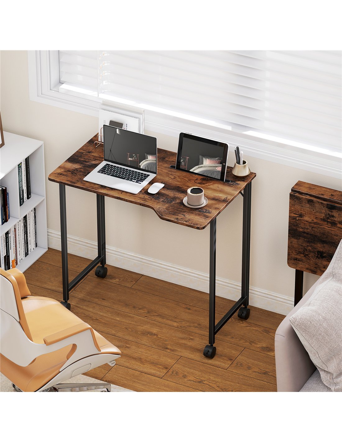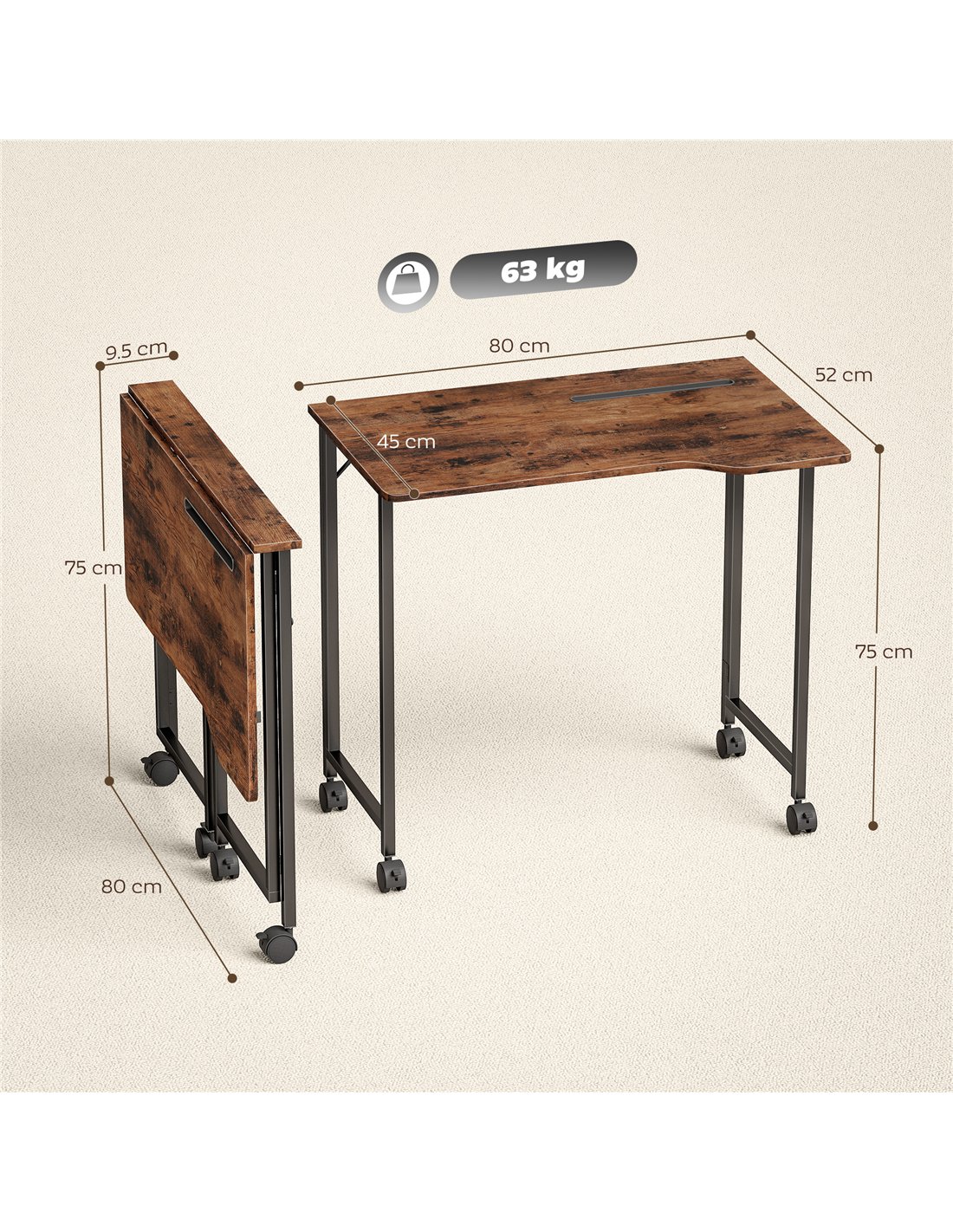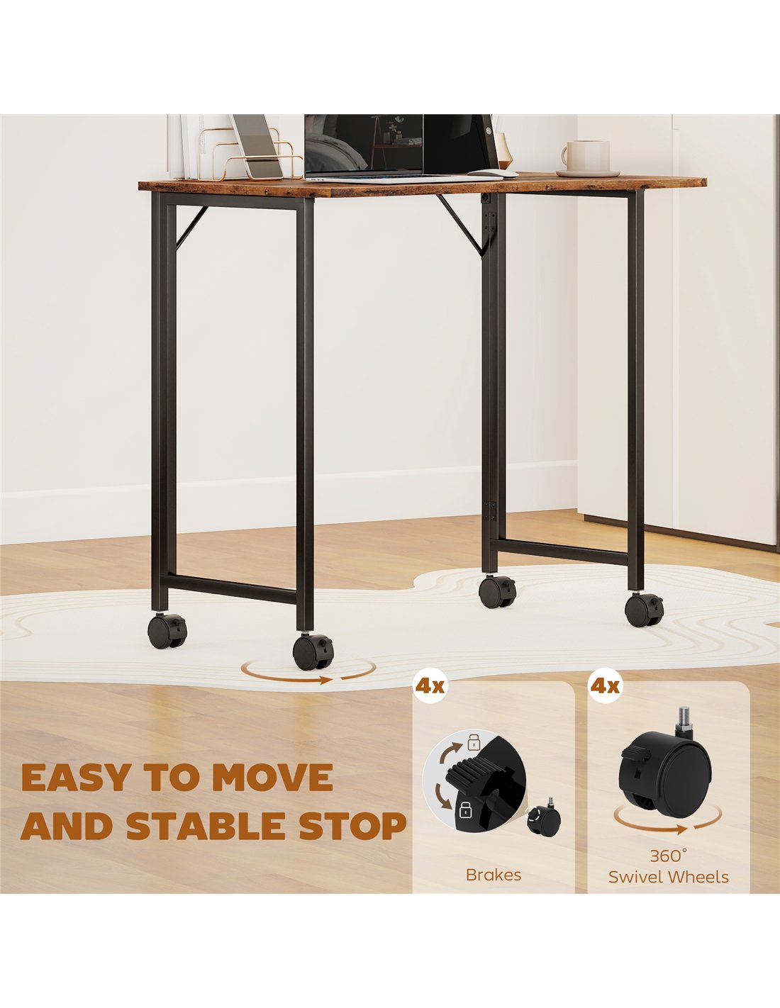 HOMCOM Folding Small Desk on Wheels - Rustic Brown