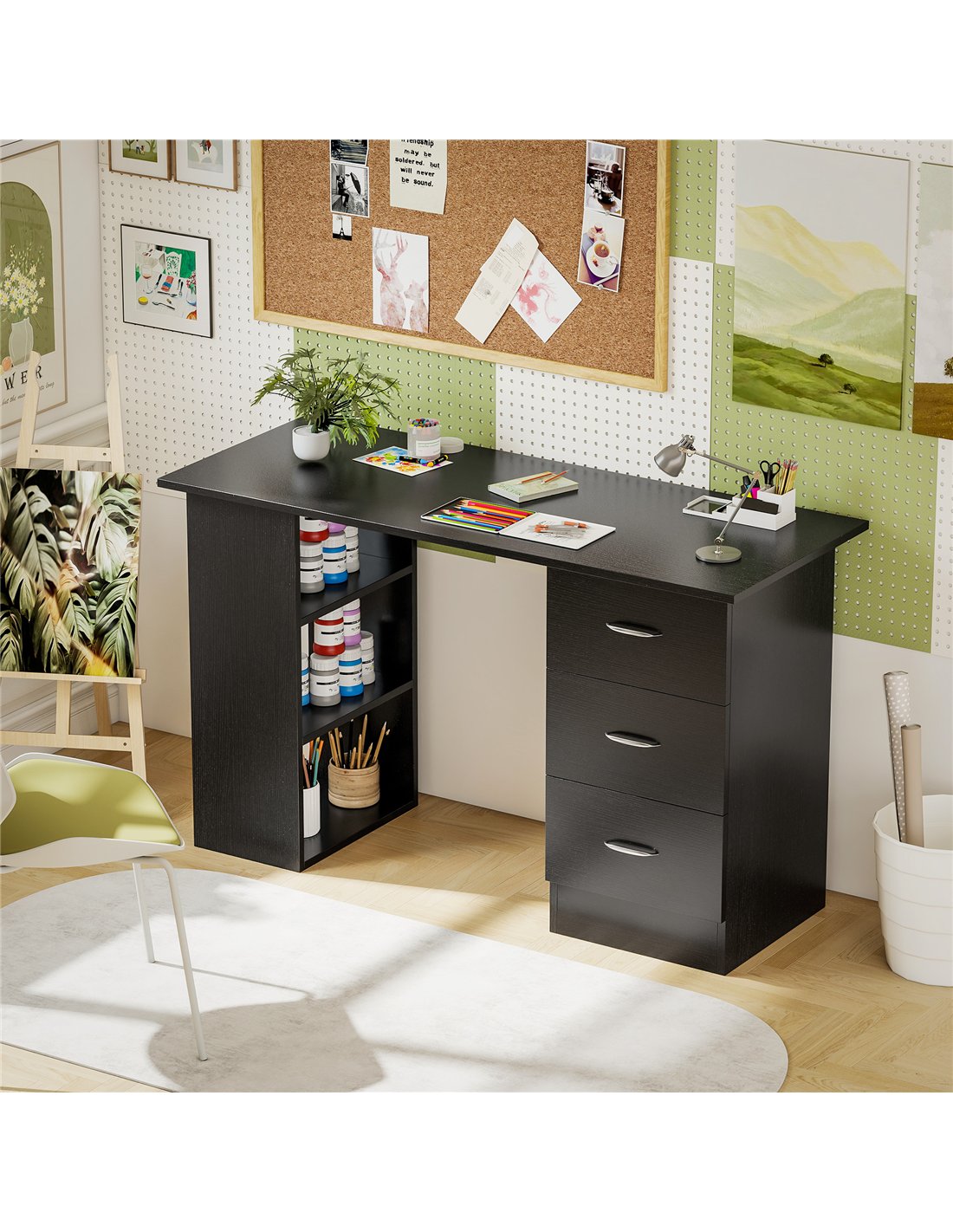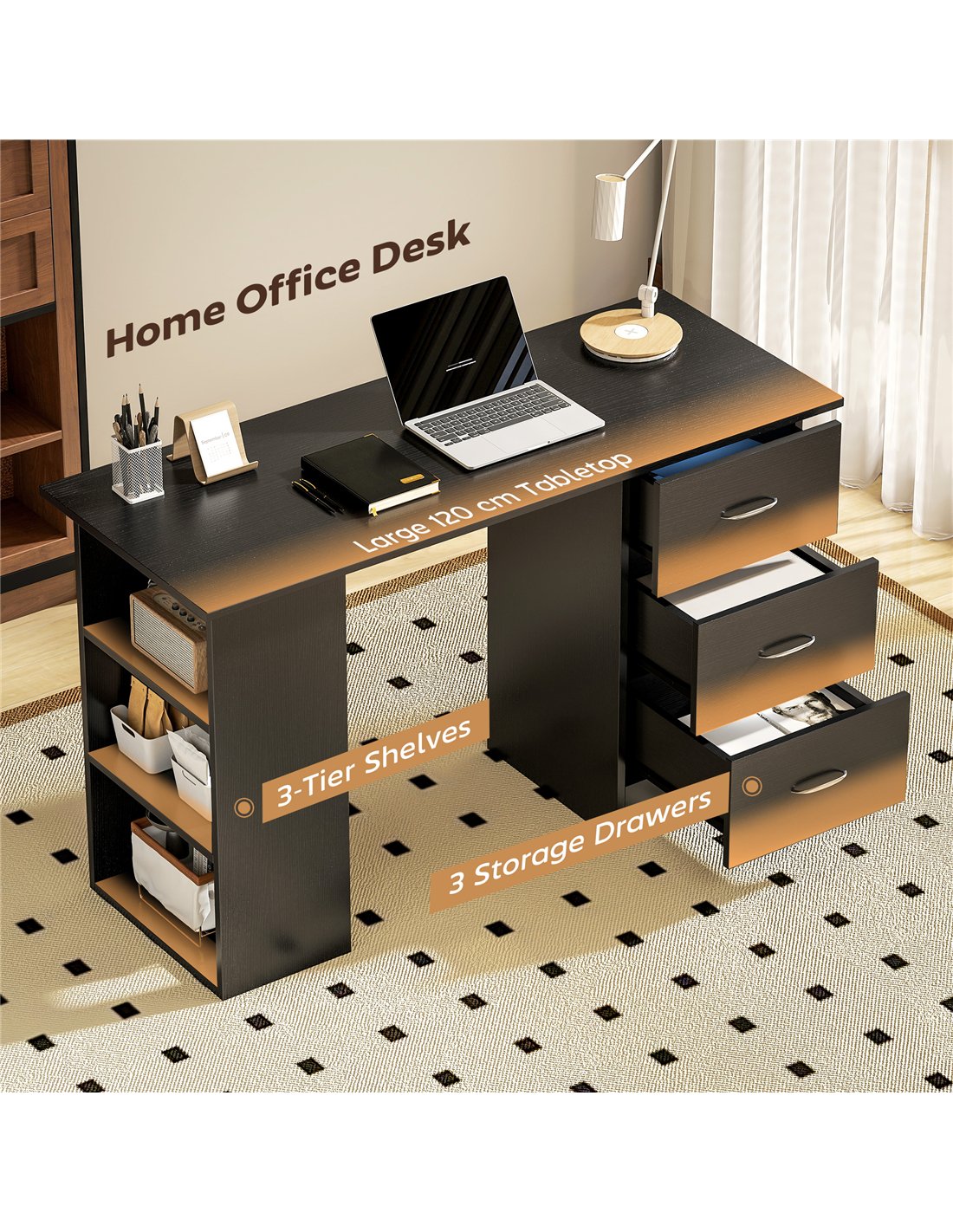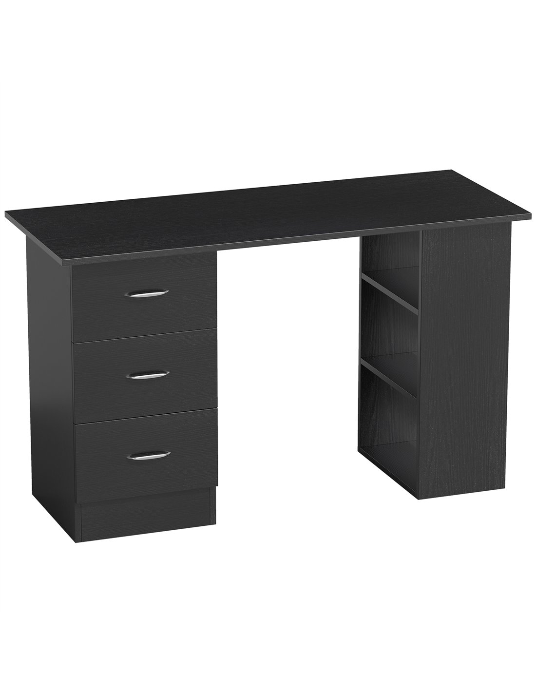 Create an efficient workspace with the HOMCOM Computer Desk, a black home office desk designed for the UK market. This writing table provides a practical solution for working or studying. Its considered design combines a generous 120 x 49 cm tabletop with integrated storage. You benefit from three enclosed drawers and three open shelves. These components offer adaptable organisation, allowing installation on either the right or left side to suit your room layout. Crafted from durable particle board, this PC workstation maintains a modern, clean aesthetic. It delivers organised space for your documents and equipment. Each drawer includes a handle for straightforward access. With overall dimensions of 120W x 49D x 72H cm, this desk supports daily productivity and tidiness in your home.
